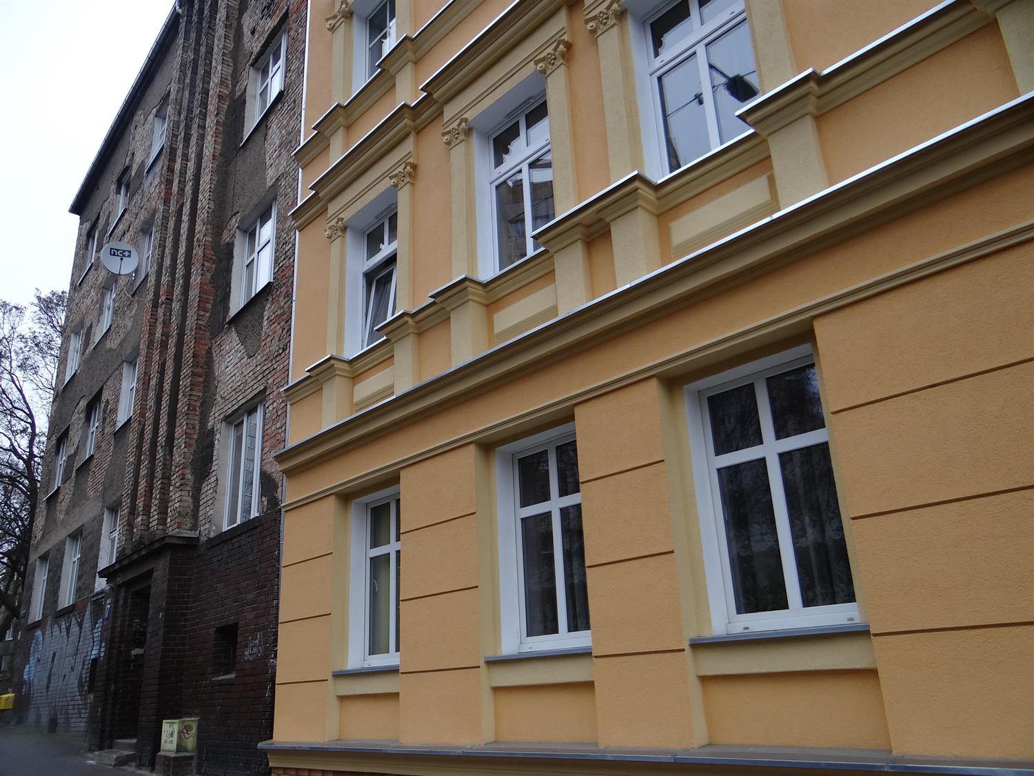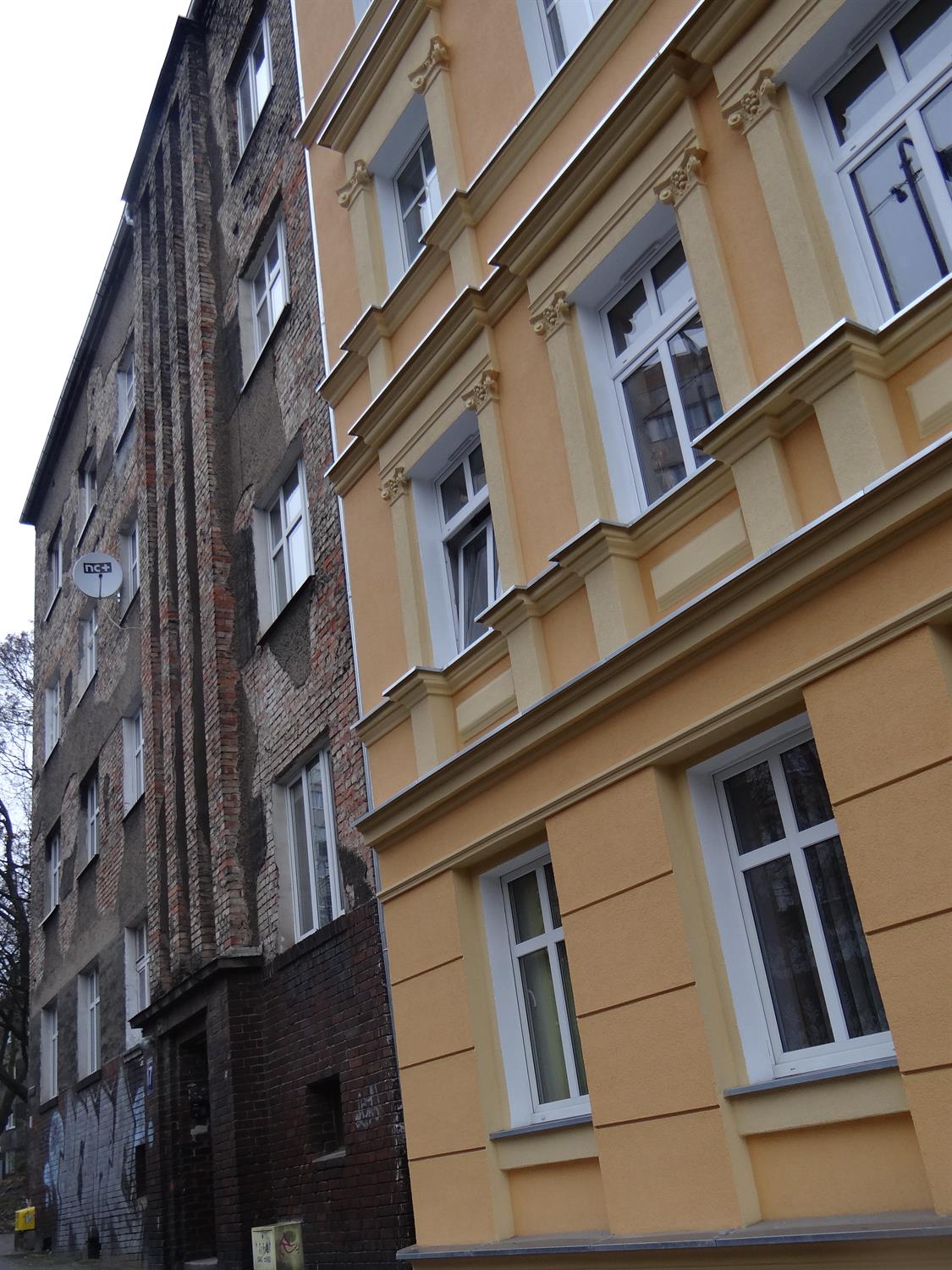 W jednym jest odtworzona z pietyzmem przedwojenna elewacja. W drugim - tłem dla talerzy telewizji satelitarnej jest mur z nagich cegieł, związanych dawno zwietrzałą zaprawą, na którym trzymają się resztki brudnego tynku.