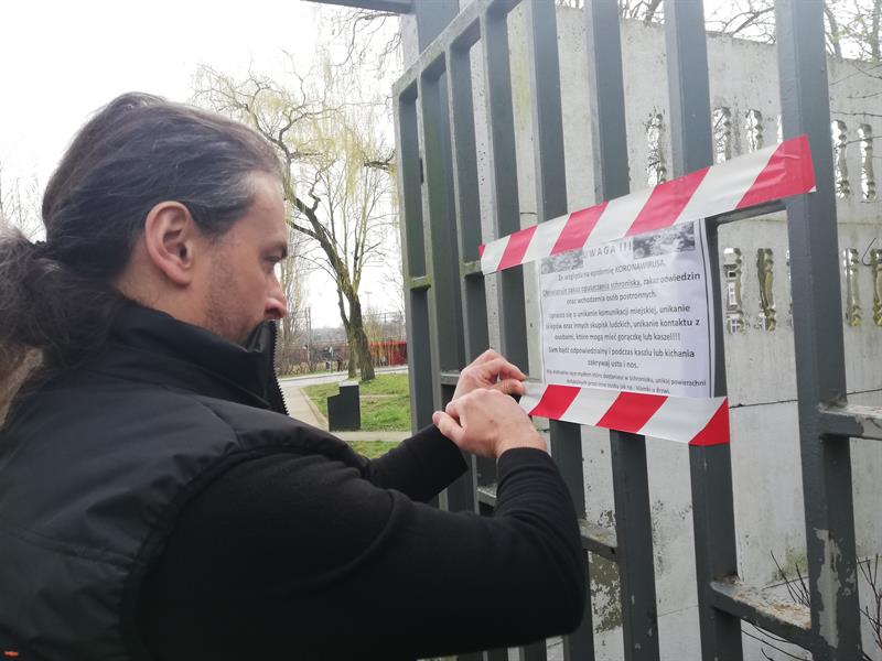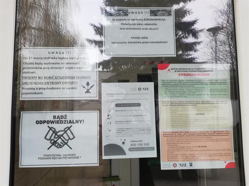 Na bramie przytuliska przy ul. Zamkniętej wisi komunikat dla mieszkańców: obowiązuje zakaz opuszczania schroniska oraz zakaz odwiedzin. Należy unikać komunikacji miejskiej, sklepów i innych skupisk ludzkich, a także osób, które mogą mieć gorączkę lub kaszel.