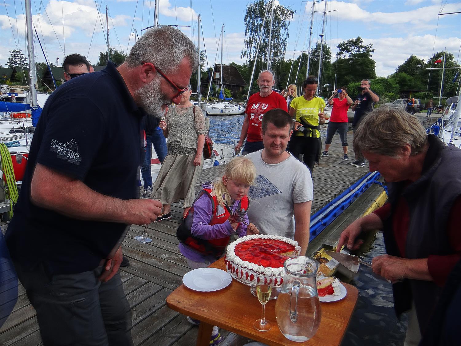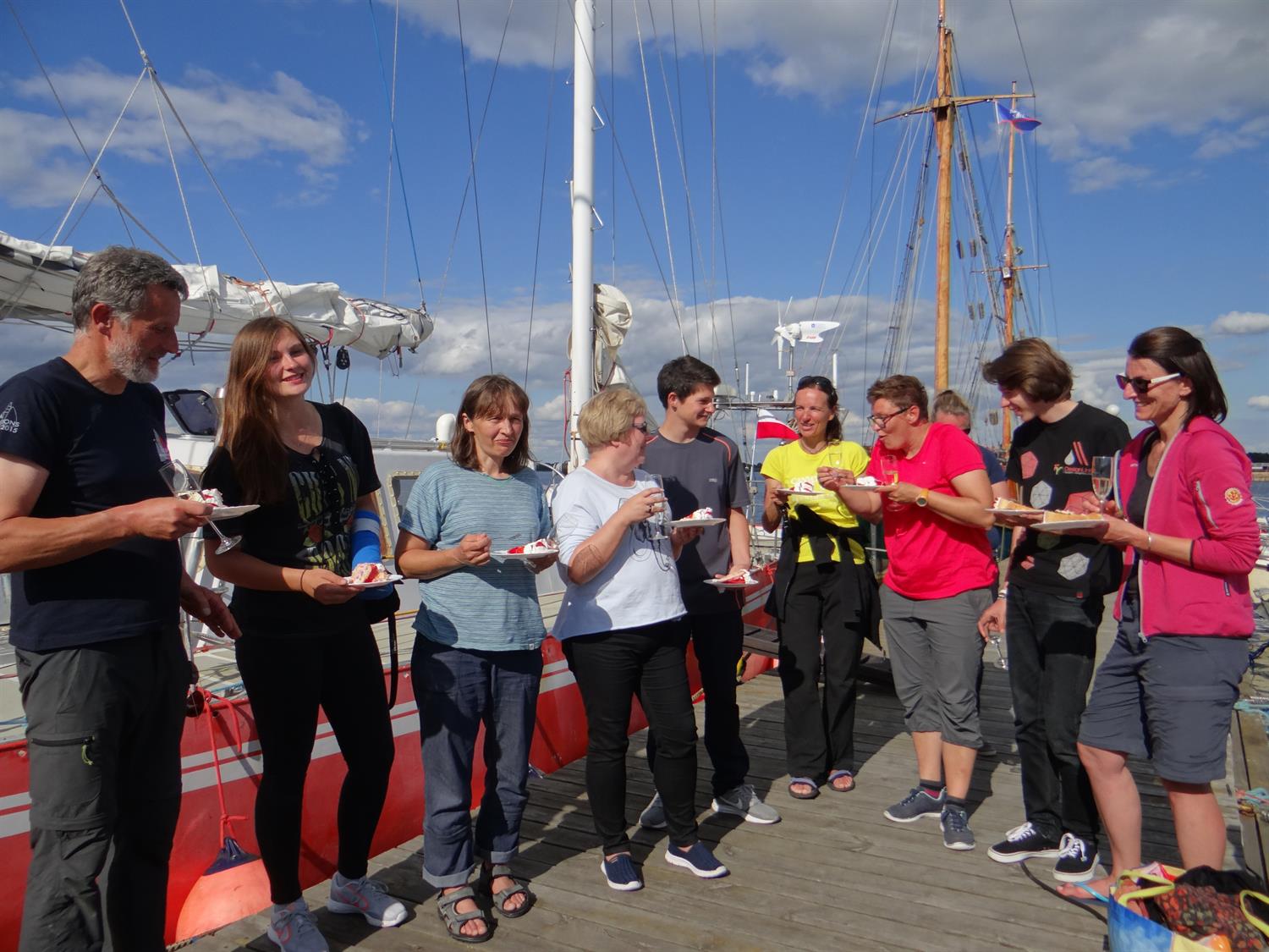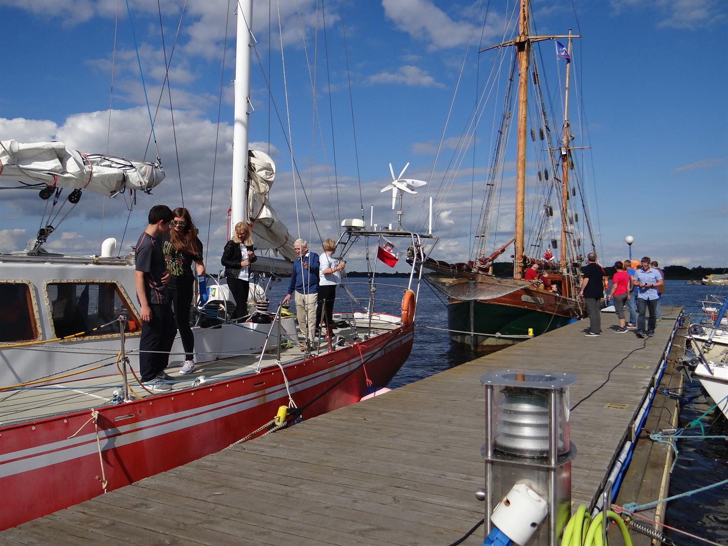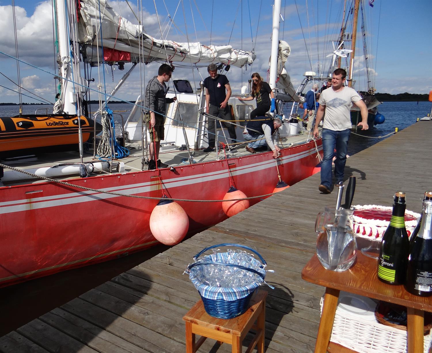 Do kei dąbskiej mariny jacht wpływał z kapitanem jachtowym żeglugi wielkiej Wojciechem Jacobsonem jako pilotem na pokładzie i w asyście honorowej oldtimera Olander, który wypłynął mu na spotkanie na szczecińskim torze wodnym. Na lądzie czekały na gości lampka szampana i tort. Witający załogę mieli okazję wejść na pokład i pod pokład. Potem były długie rozmowy w tawernie, czas na pierwsze refleksje i wspomnienia o ludziach z rodziny żeglarskiej, w tym tych, którzy odeszli, jak choćby o Ludku, Ludojadzie, czyli Ludomirze Mączce, jak zwykli o nim mawiać ci co go znali, z nim żeglowali i byli jego przyjaciółmi nie tylko na wodzie, ale i na lądzie.
