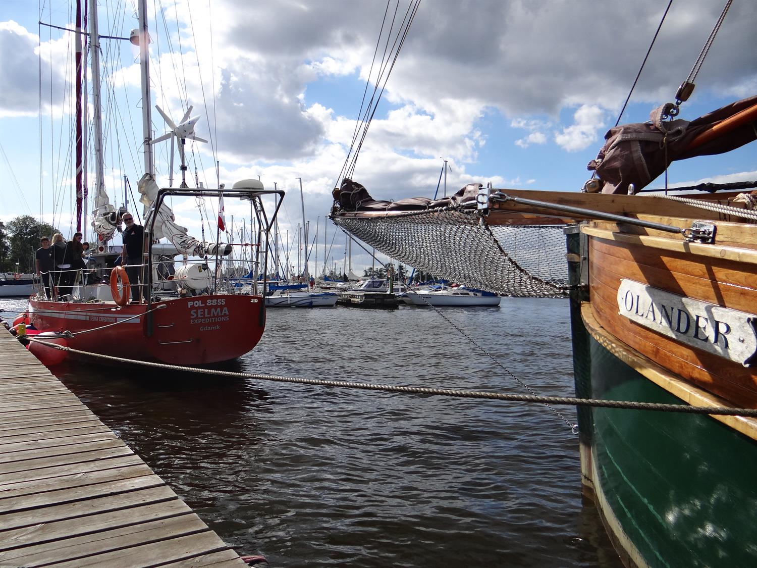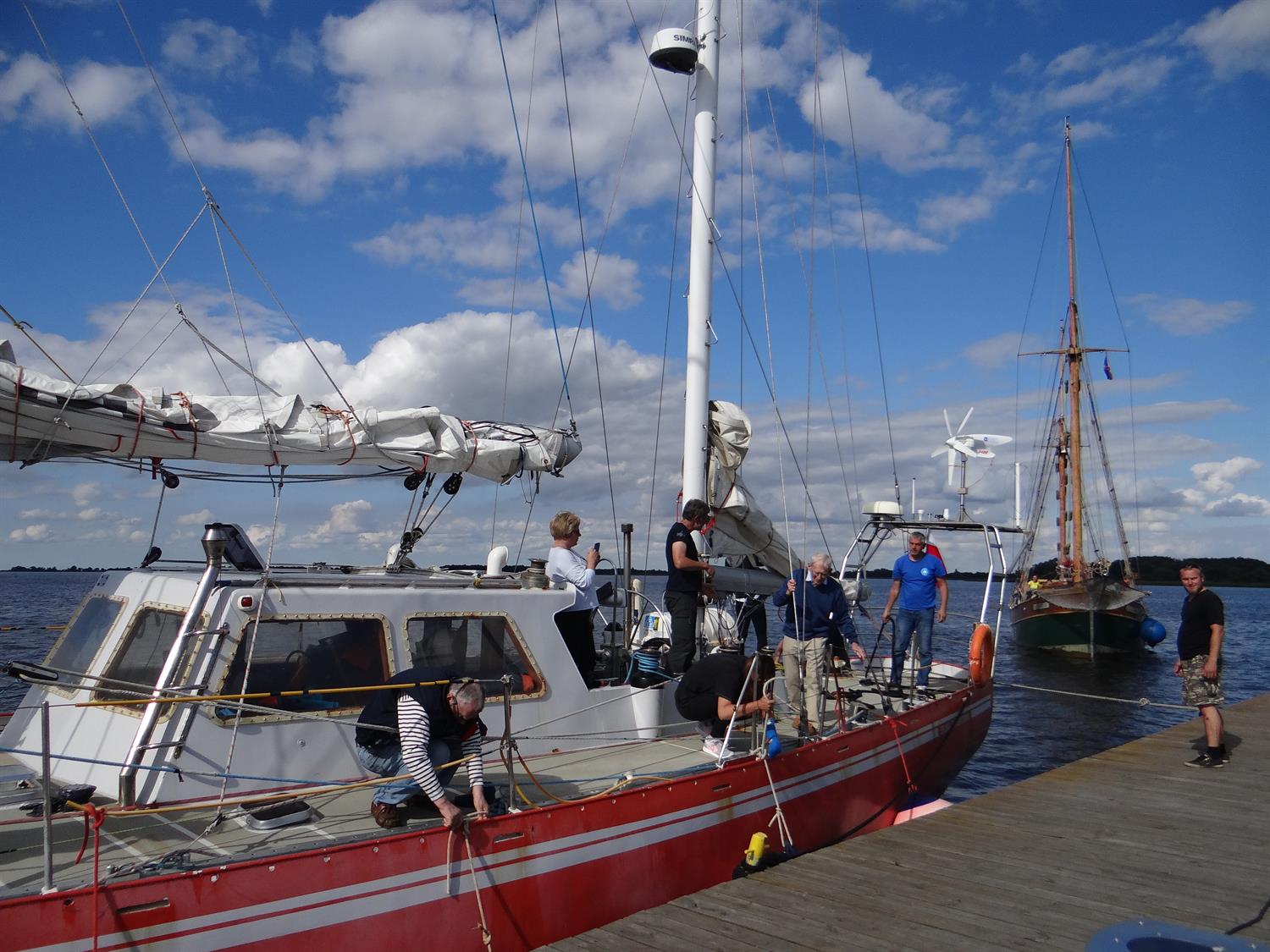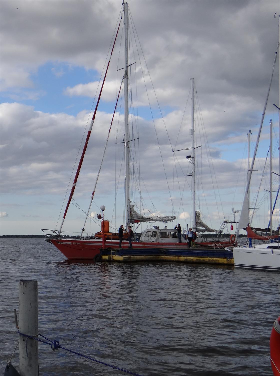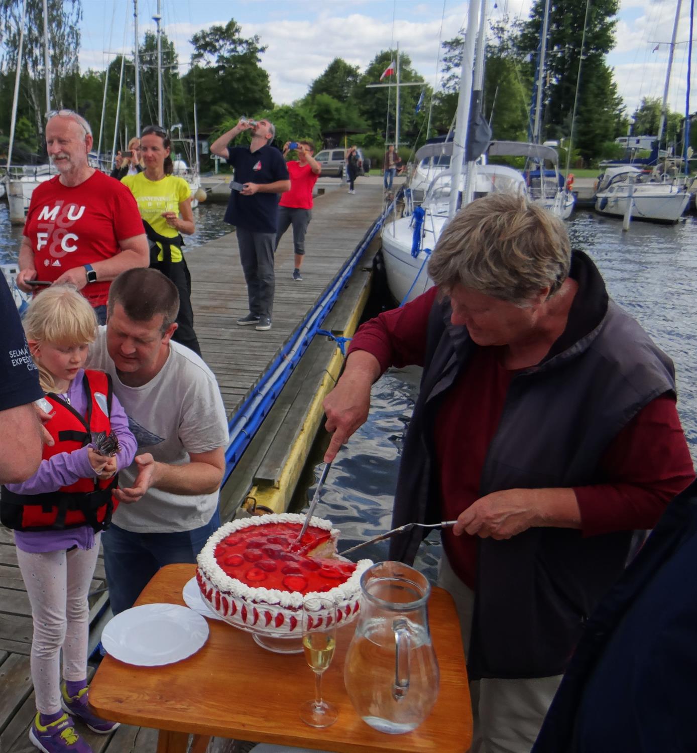 Do kei dąbskiej mariny jacht wpływał z kapitanem jachtowym żeglugi wielkiej Wojciechem Jacobsonem jako pilotem na pokładzie i w asyście honorowej oldtimera Olander, który wypłynął mu na spotkanie na szczecińskim torze wodnym. Na lądzie czekały na gości lampka szampana i tort. Witający załogę mieli okazję wejść na pokład i pod pokład. Potem były długie rozmowy w tawernie, czas na pierwsze refleksje i wspomnienia o ludziach z rodziny żeglarskiej, w tym tych, którzy odeszli, jak choćby o Ludku, Ludojadzie, czyli Ludomirze Mączce, jak zwykli o nim mawiać ci co go znali, z nim żeglowali i byli jego przyjaciółmi nie tylko na wodzie, ale i na lądzie.