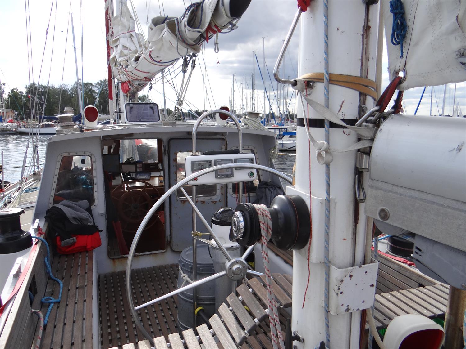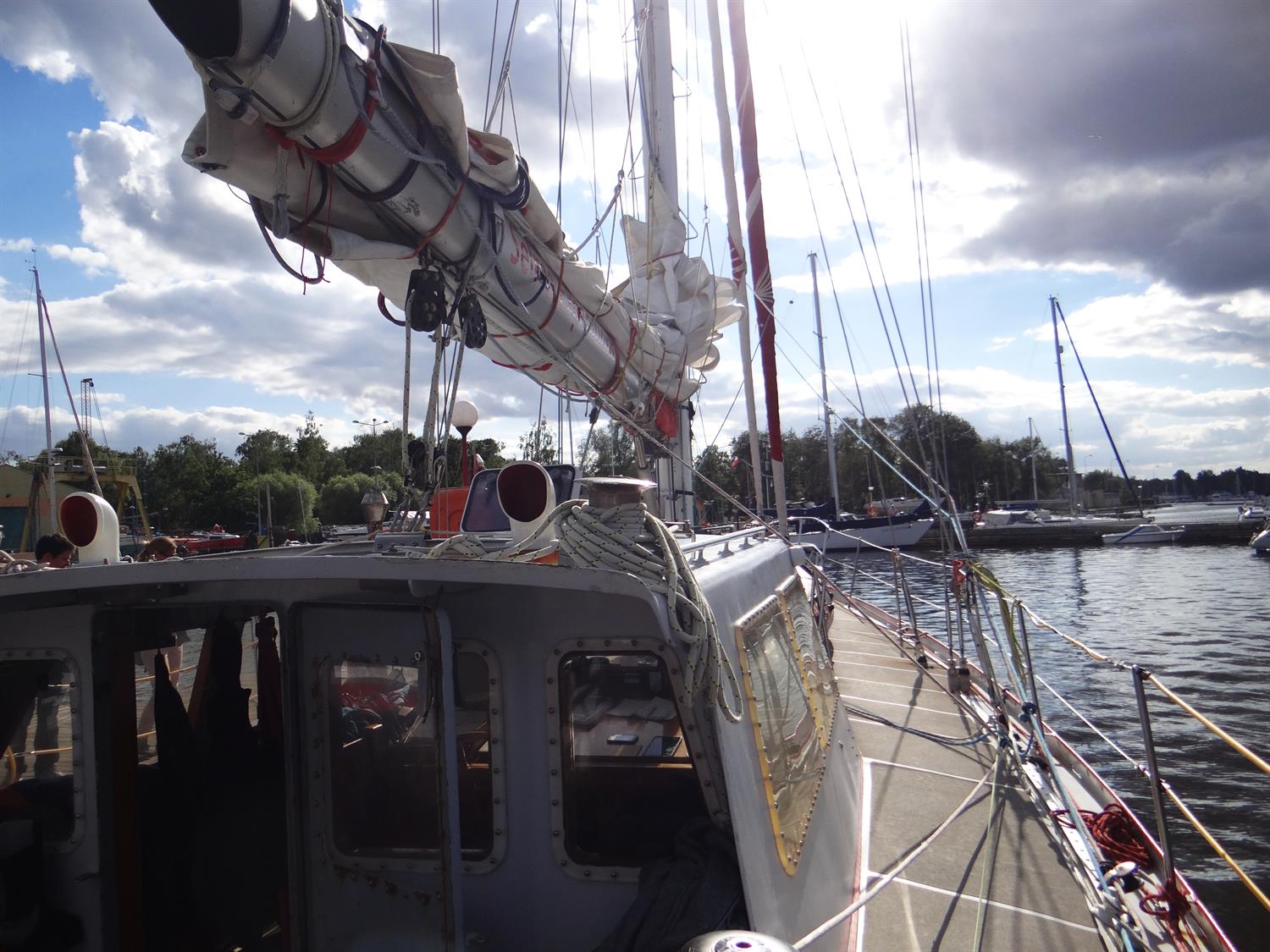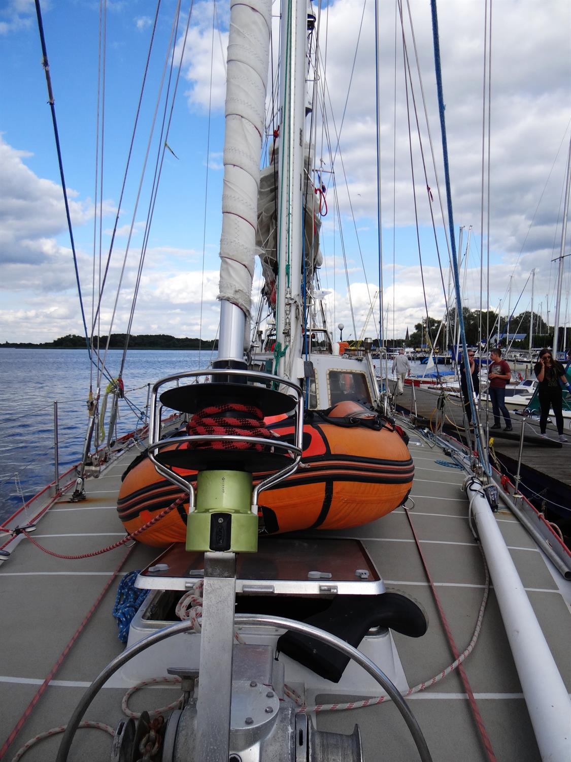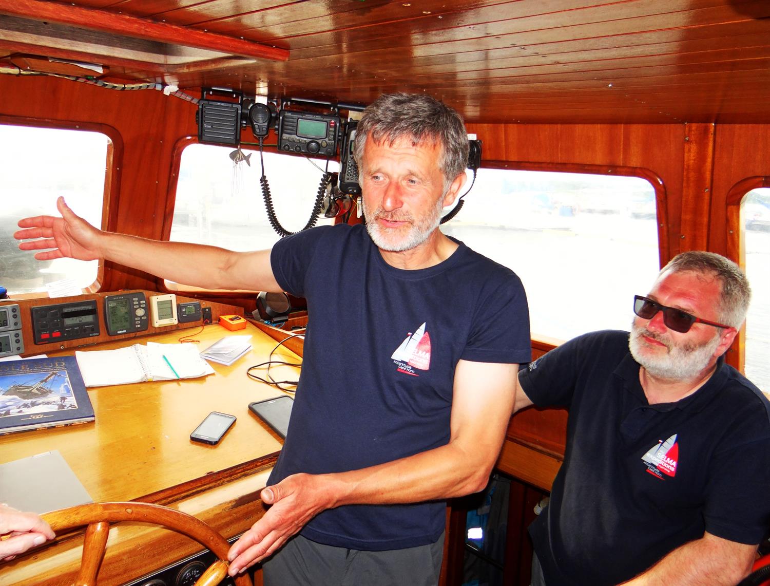 Do kei dąbskiej mariny jacht wpływał z kapitanem jachtowym żeglugi wielkiej Wojciechem Jacobsonem jako pilotem na pokładzie i w asyście honorowej oldtimera Olander, który wypłynął mu na spotkanie na szczecińskim torze wodnym. Na lądzie czekały na gości lampka szampana i tort. Witający załogę mieli okazję wejść na pokład i pod pokład. Potem były długie rozmowy w tawernie, czas na pierwsze refleksje i wspomnienia o ludziach z rodziny żeglarskiej, w tym tych, którzy odeszli, jak choćby o Ludku, Ludojadzie, czyli Ludomirze Mączce, jak zwykli o nim mawiać ci co go znali, z nim żeglowali i byli jego przyjaciółmi nie tylko na wodzie, ale i na lądzie.