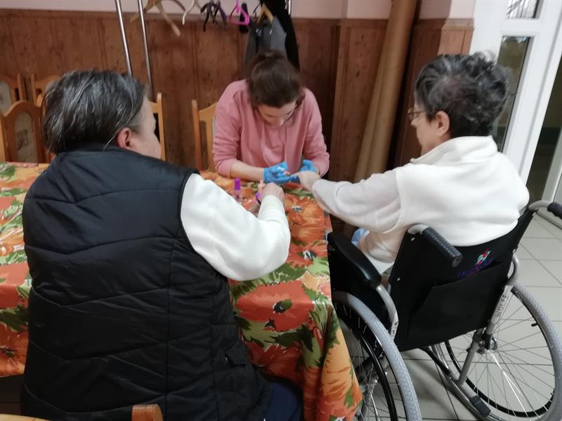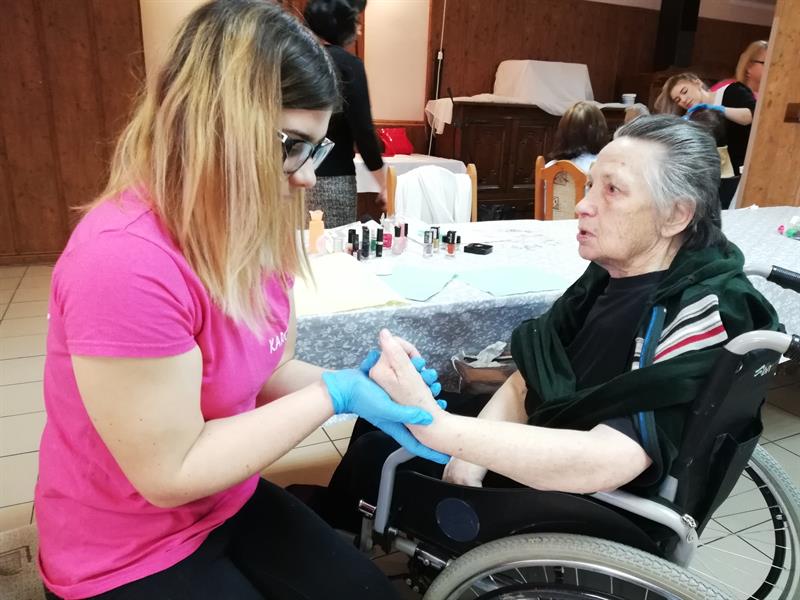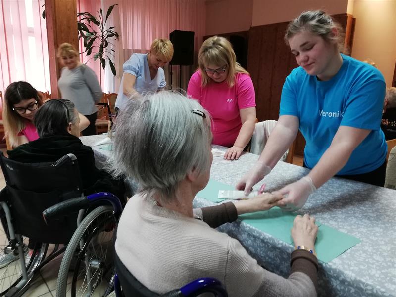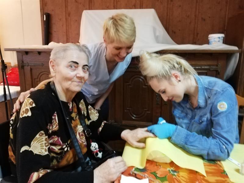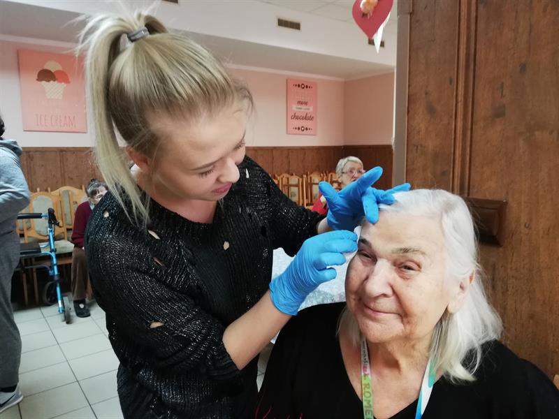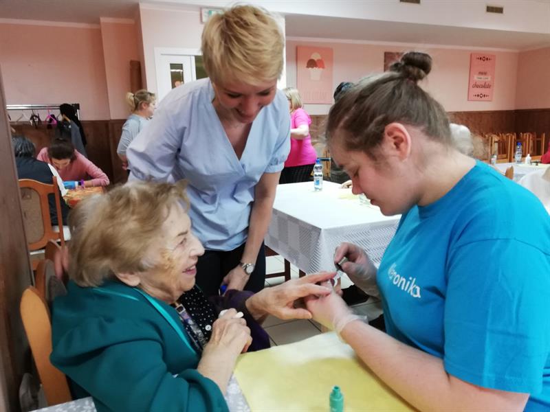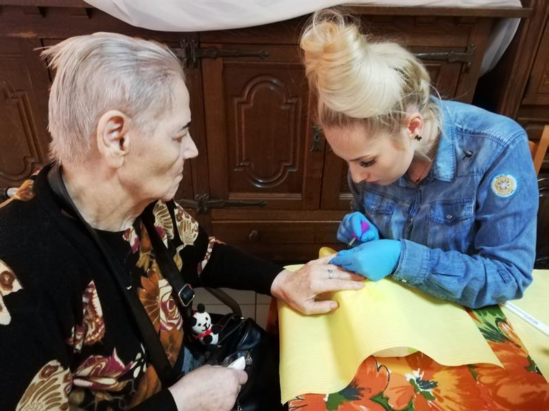 Wyjątkowy czas poświęcony urodzie starszych pań to wspólny pomysł DPS oraz Zachodniopomorskiego Centrum Kształcenia Zawodowego i Ustawicznego przy ul. Broniewskiego w Szczecinie. Uczennice dwóch kierunków - terapii zajęciowej oraz technik usług kosmetycznych pod opieką swoich nauczycielek po raz drugi odwiedziły mieszkanki domu, by te mogły poczuć się piękne. Były masaże dłoni, manicure, malowanie paznokci, regulacja brwi i henna.