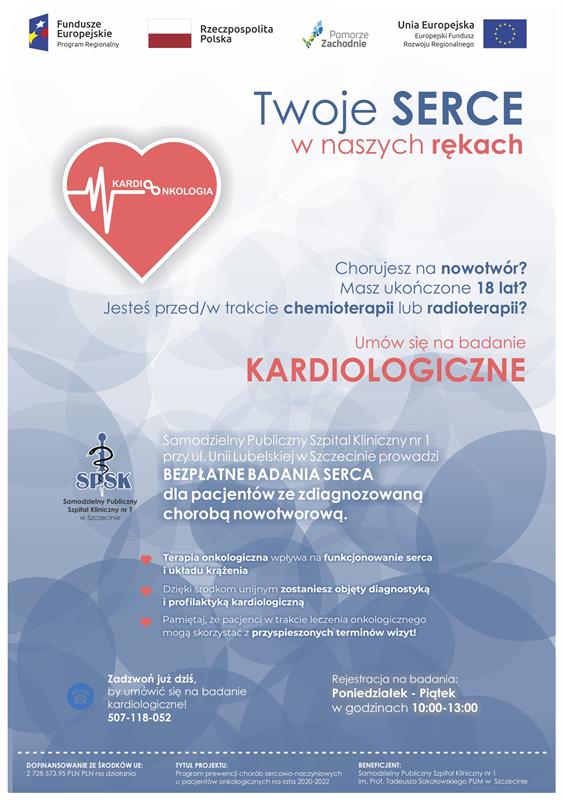 Nowoczesne terapie onkologiczne zwiększają szansę na wyzdrowienie, są ratunkiem w walce z rakiem. Stosowane leczenie może jednak u niektórych pacjentów prowadzić do powikłań układu sercowo-naczyniowego. Ważne więc, żeby mieli dostęp do kardiologów. Ułatwia go program „Twoje serce w naszych rękach”. Prowadzony jest w Samodzielnej Pracowni Nieinwazyjnej Diagnostyki Serca w Samodzielnym Publicznym Szpitalu Klinicznym nr 1 PUM przy ul. Unii Lubelskiej w Szczecinie. Pacjenci będący w trakcie leczenia onkologicznego mogą skorzystać z przyspieszonych terminów wizyt.