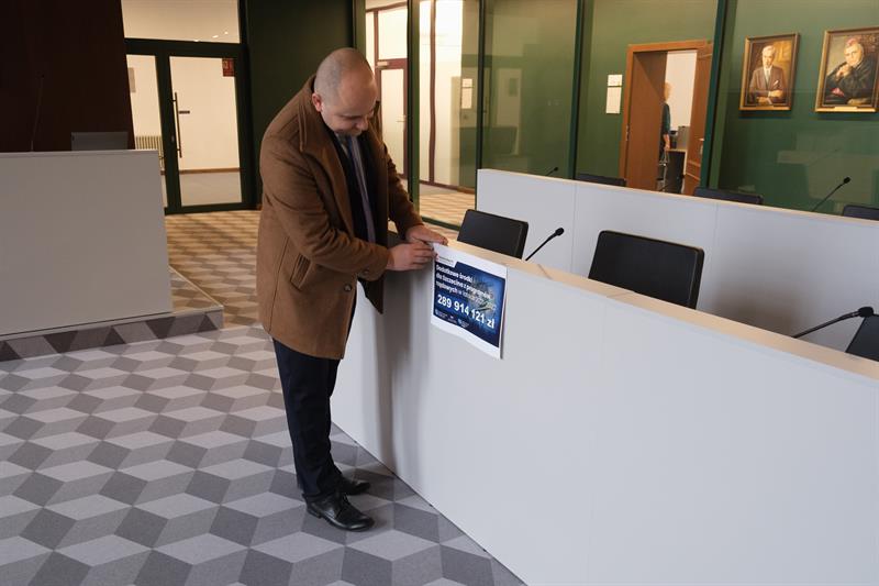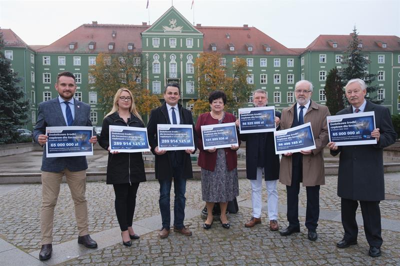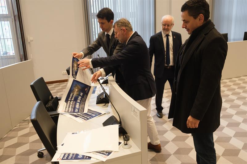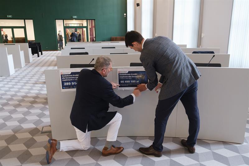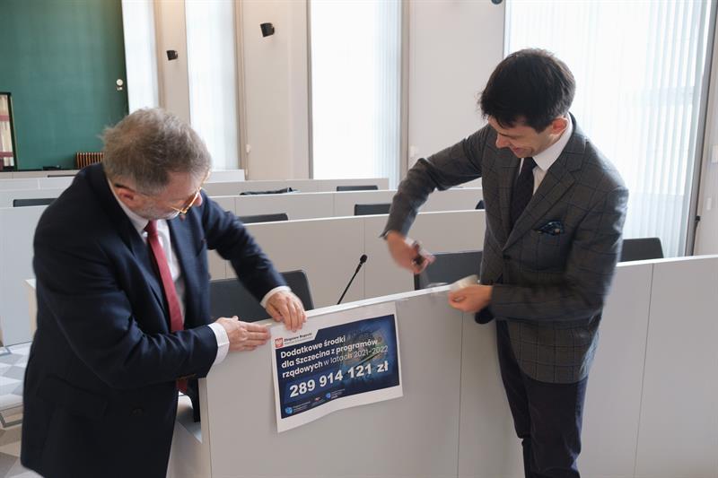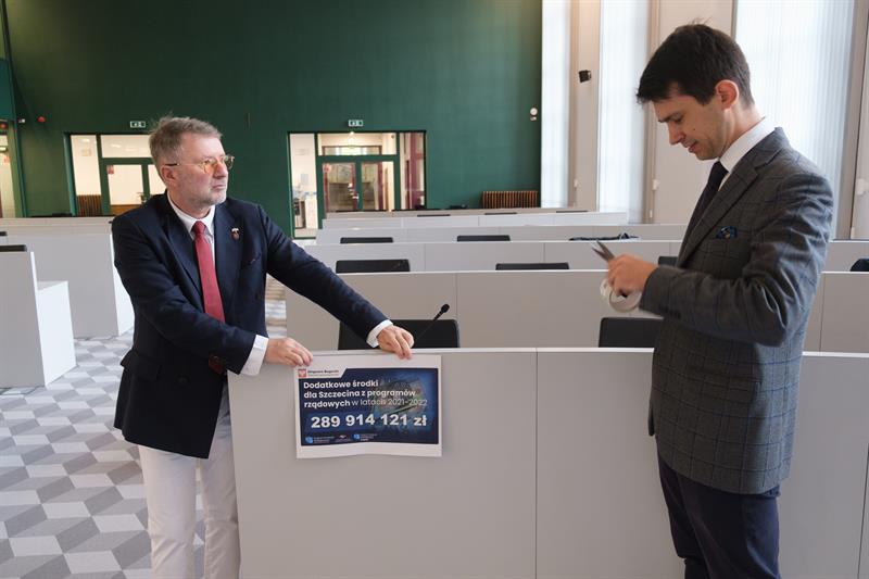 Plansze z kwotami wsparcia udzielonego Szczecinowi dzięki rządowi PiS radni tego klubu zaprezentowali na Jasnych Błoniach, a następnie rozwiesili w sali sesyjnej. Fot. Dariusz GORAJSKI