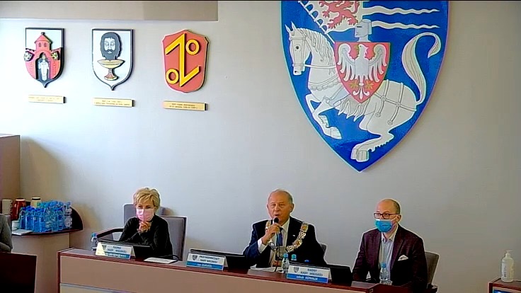 Na zdjęciu: Posiedzenie odbyło się w trybie stacjonarnym, ale z zachowaniem reżimu sanitarnego. Przewodniczący Jan Kuriata zarządzał przerwy na przewietrzenie sali obrad samorządowców