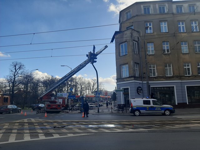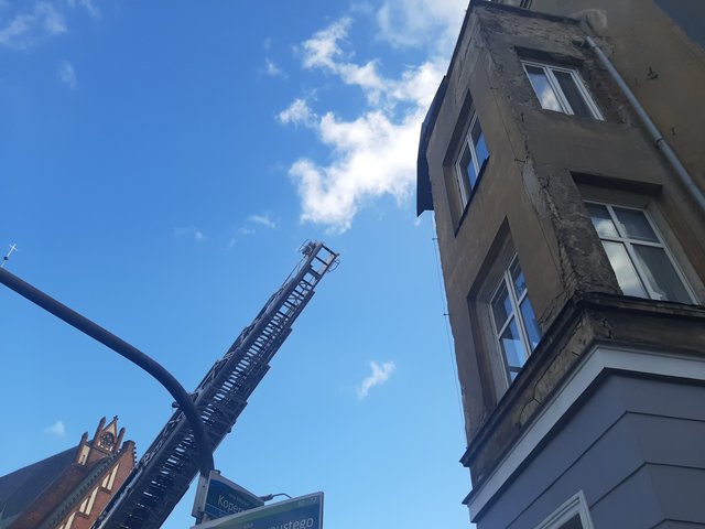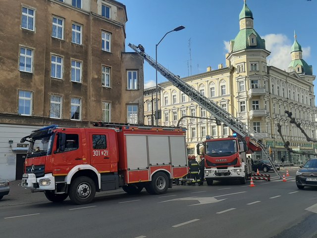 Połać dachu spadła na balkon jednego z mieszkań kamienicy. Nikomu nic się stało. Ruch w tym miejscu odbywa się bez zakłóceń.