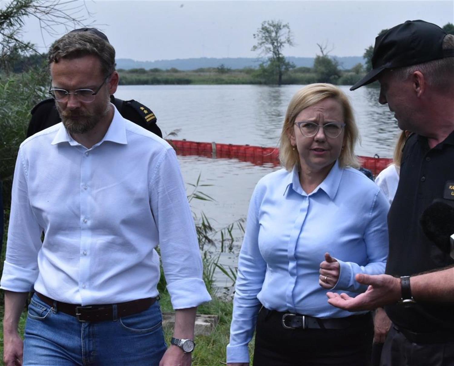 Szefowa resortu klimatu i środowiska Anna Moskwa gościła w piątek (19 sierpnia) w Gryfinie. Dziękowała służbom, wolontariuszom i mieszkańcom zaangażowanym w oczyszczanie Odry. Na konferencji prasowej poinformowała, że śnięte ryby są efektywnie usuwane. Szczególnie pomagają w tym zapory. Podała też, że pierwsze wyniki badań wskazują na obecność w rzece złotych alg. Ich zakwit może spowodować pojawianie się toksyn zabijających ryby i małże.