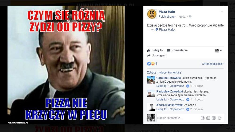 W sieci rozpętała się burza po tym jak na stronie internetowej świnoujskiej pizzerii „Pizza Halo” ukazał się mem z Adolfem Hitlerem. Napis pod zdjęciem głosi: „Czym się różnią Żydzi od pizzy? Pizza nie krzyczy w piecu”. Właściciele zapewniają, że to nie oni zamieścili mem, a doszło do włamania na profil.
