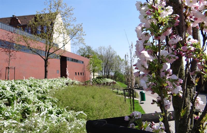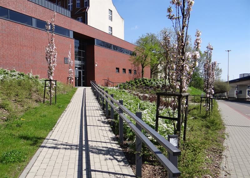 W sąsiedztwie remontowanej nitki Trasy Zamkowej oraz przypominającego slumsy terenu przy Piwnicy Kany zaszła duża zmiana. Na dobre. Na skarpie, niejako na tyłach Zespołu Szkół Sportowych im. Sportowców Ziemi Szczecińskiej, został bowiem zaaranżowany oryginalny zieleniec. Efektownie i z rozmachem, o czym najlepiej się przekonać właśnie teraz, gdy jest w rozkwicie: przyciągają uwagę różowe wiśnie japońskie na tle pachnącego morza drobnych białych kwiatów, jakimi są obsypane dziesiątki rosnących tam tawuł.