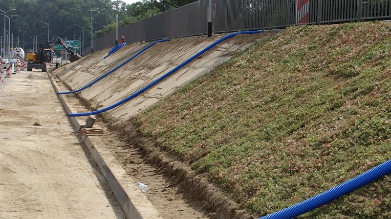 Stok dosłownie spłynął w niespełna tydzień po wyłożeniu go matami z sukulentów. Te w większości jednak po ulewie zjechały w dół niczym ze ślizgawki. Powstałe liczne wyżłobienia odkryły m.in. wkopane wcześniej w grunt rury z kablami zasilającymi nowe latarnie uliczne, a zwały podłoża wylądowały na jezdni biegnącej na tym odcinku kilka metrów poniżej pobocza z chodnikiem i ścieżką rowerową.