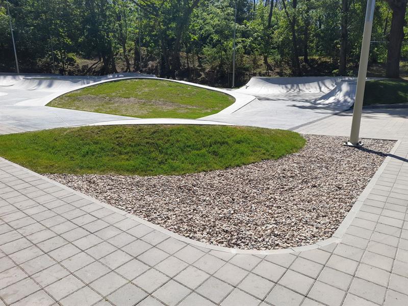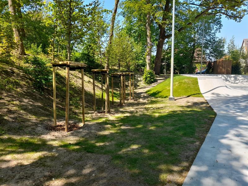 Pojawiły się również nasadzenia: 30 drzew z gatunku wiąz holenderski, grab pospolity, żywotnik zachodni oraz prawie 300 krzewów z gatunku irga płożąca, irga Dammera oraz berberys Thunberga, a także trawniki. Jest też poidełko i nowe oświetlenie, w tym specjalnie dedykowane takim obiektom jak skatepark. Aktom wandalizmu ma zapobiegać monitoring.