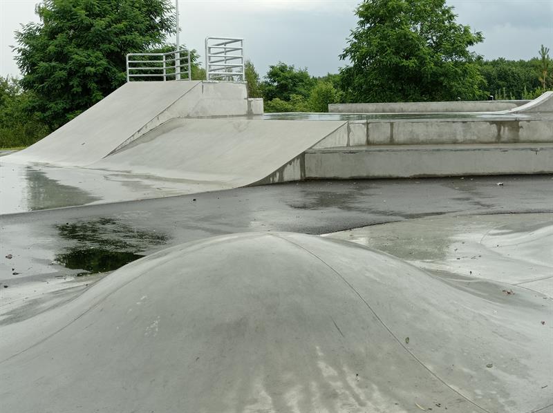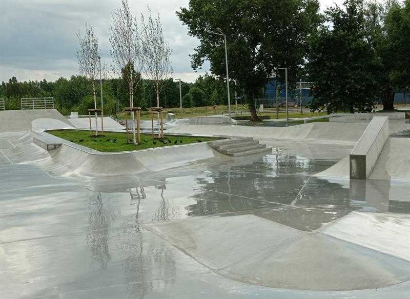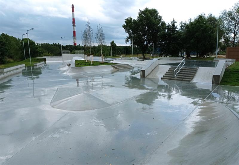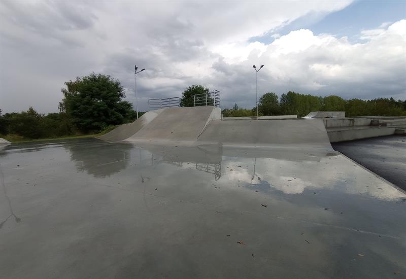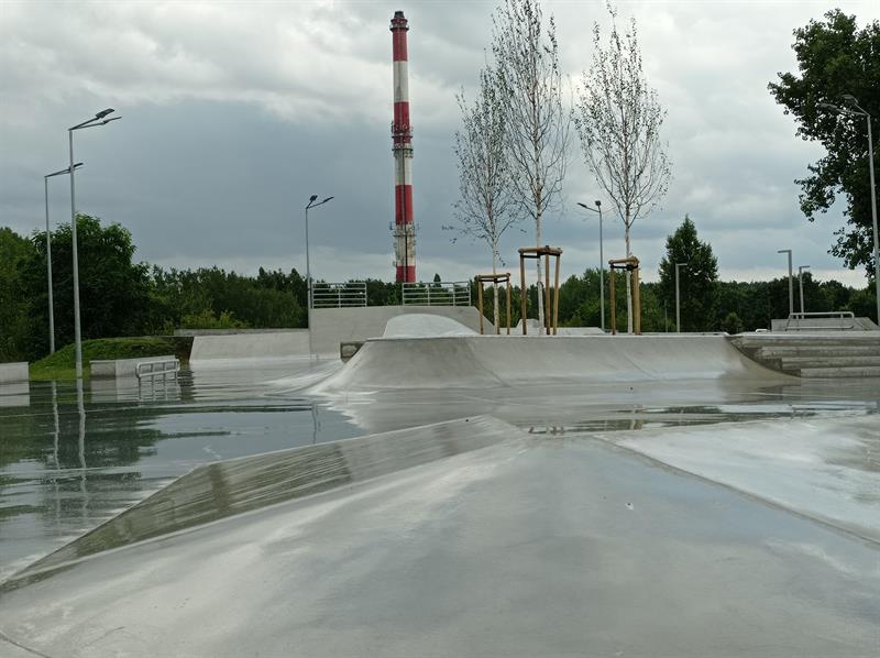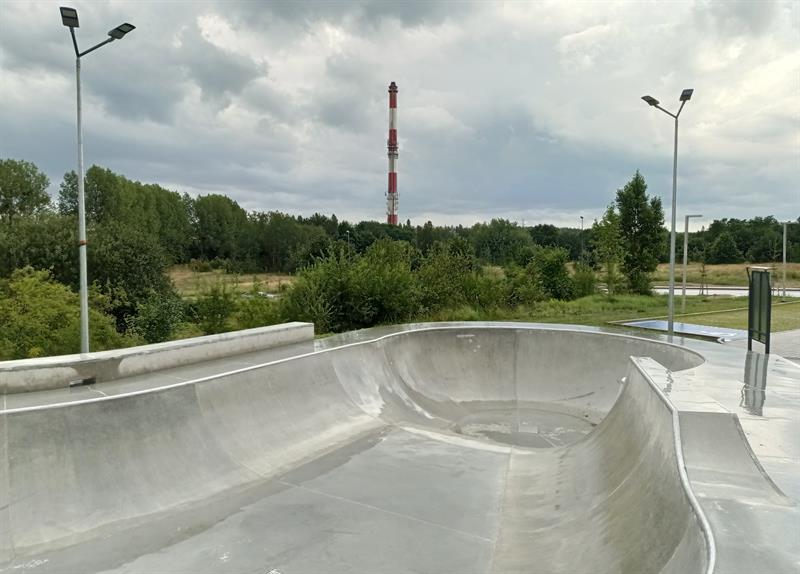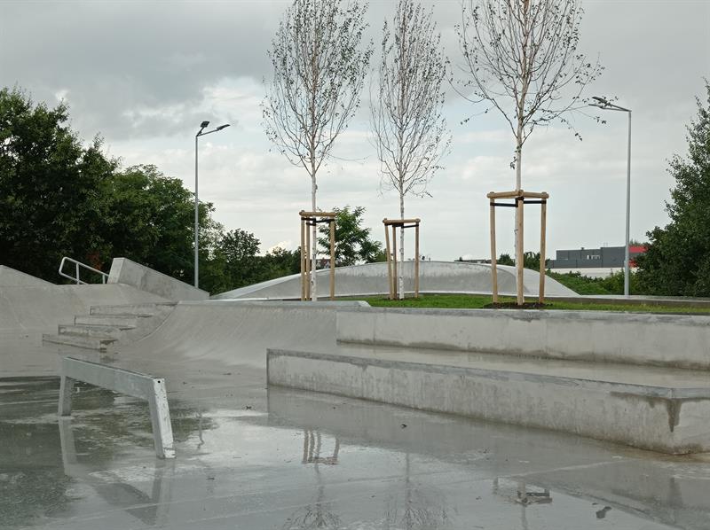 Przy skateparku jest też niewielki parking z miejscami postojowymi na 10 aut. Poprowadzone zostały wszystkie niezbędne przyłącza: wodociągowe, kanalizacyjne oraz elektryczne. Ustawiono tam też kosze na śmieci i okazały parawan na dodatkowe większe kubły na odpady.