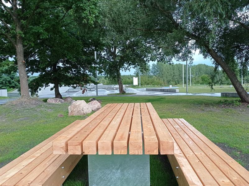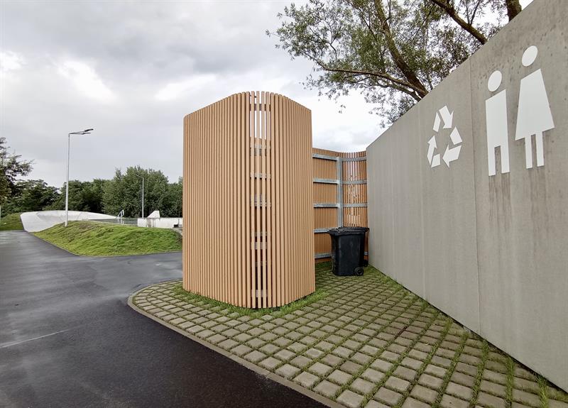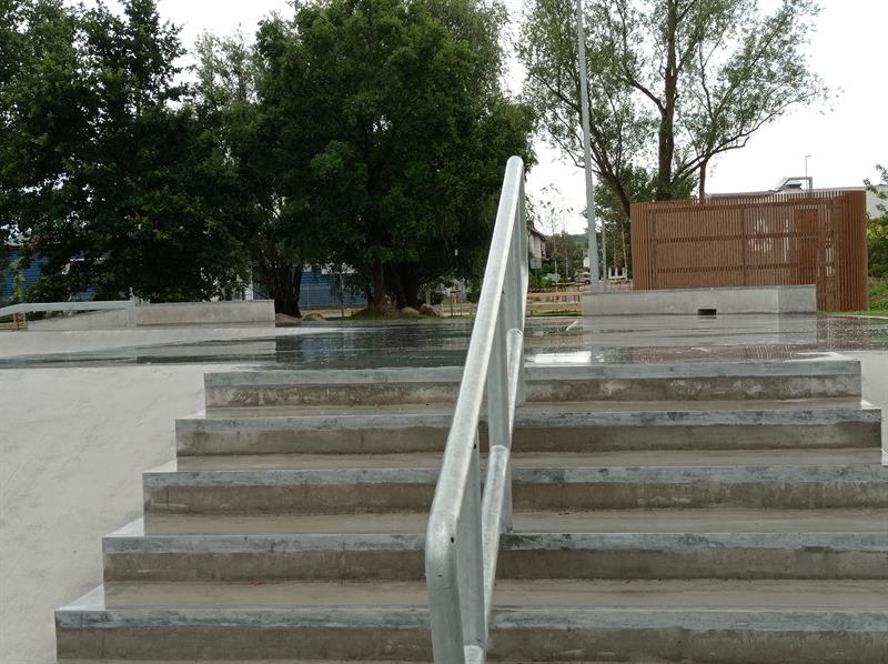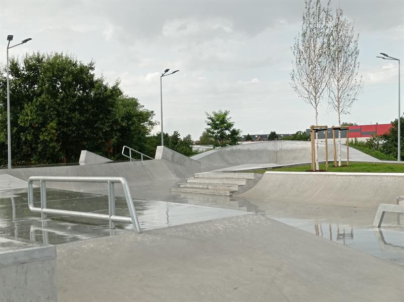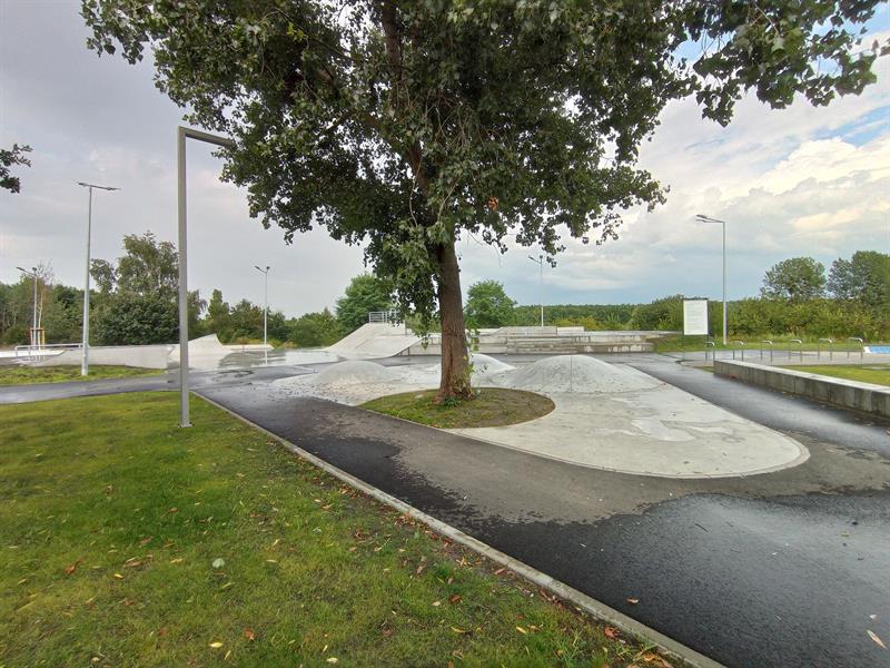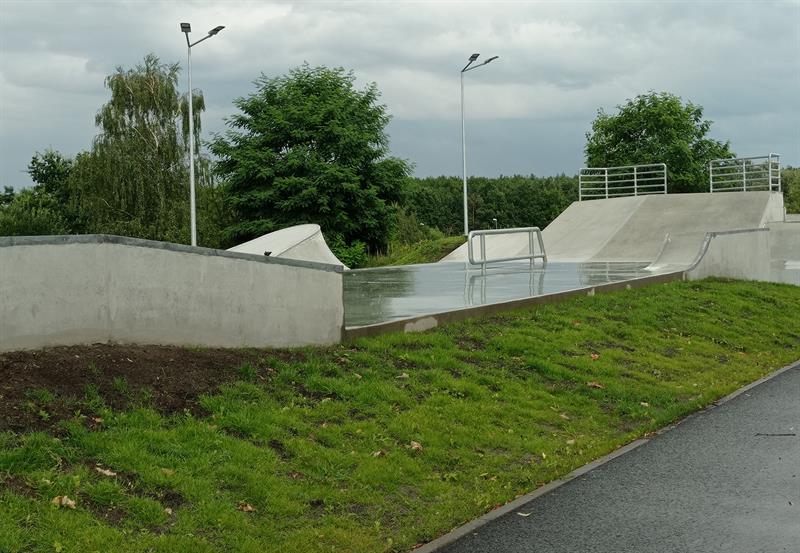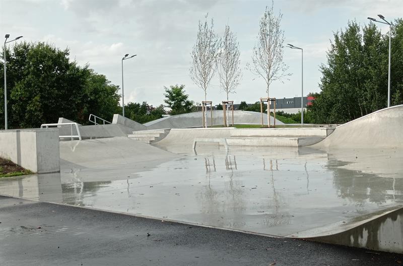 Przy skateparku jest też niewielki parking z miejscami postojowymi na 10 aut. Poprowadzone zostały wszystkie niezbędne przyłącza: wodociągowe, kanalizacyjne oraz elektryczne. Ustawiono tam też kosze na śmieci i okazały parawan na dodatkowe większe kubły na odpady.