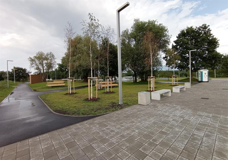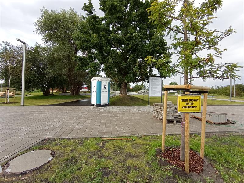 Na terenie o powierzchni ponad 1400 mkw. są też elementy małej architektury: ławki, trzy stoły piknikowe z siedziskami z drewna, stojaki rowerowe. Wszystko oświetlone. Pojawiły się nowe nasadzenia w postaci 15 drzew: 10 brzóz oraz 5 glediczji. Każde z nich ma co najmniej 18 centymetrów w obwodzie pnia. Część tych okazów już jednak zdążyło pożółknąć. Wygląda to tak, jakby usychały. Mimo zapowiedzi ZUK, zleceniodawcy prac, że na terenie tym znajdzie zastosowanie rozwiązanie ekologiczne w zakresie wykorzystywania deszczówki – ta miała być gromadzona w zbiornikach i służyć do podlewania roślin.