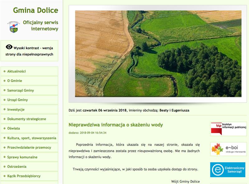 Na zdjęciu: Po ataku hakerskim na stronie internetowej Urzędu Gminy w Dolicach ukazał się komunikat wójta dementujący fałszywe informacje o skażeniu wody.