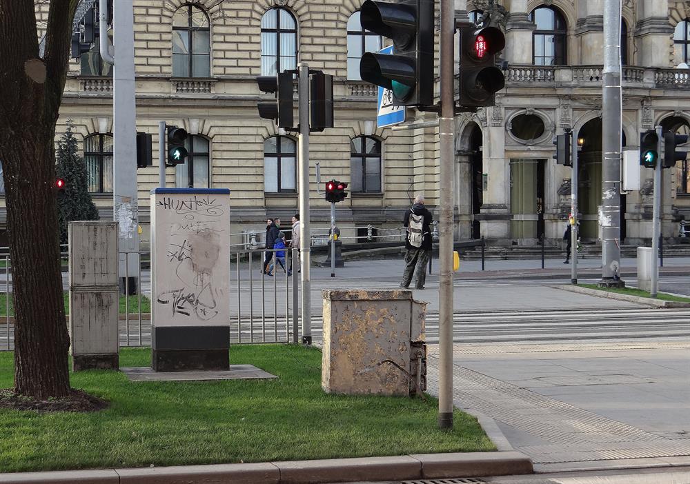 Takie właśnie eksponaty ostały się w pasie wyłożonego zieloną trawą z rolki pobocza w odnowionej najdroższej alei Szczecina - w al. Niepodległości. Zapyziałe i z odłażącą z nich farbą tuż przy nowym przejściu dla pieszych i nie tylko zresztą w tym miejscu. ©℗