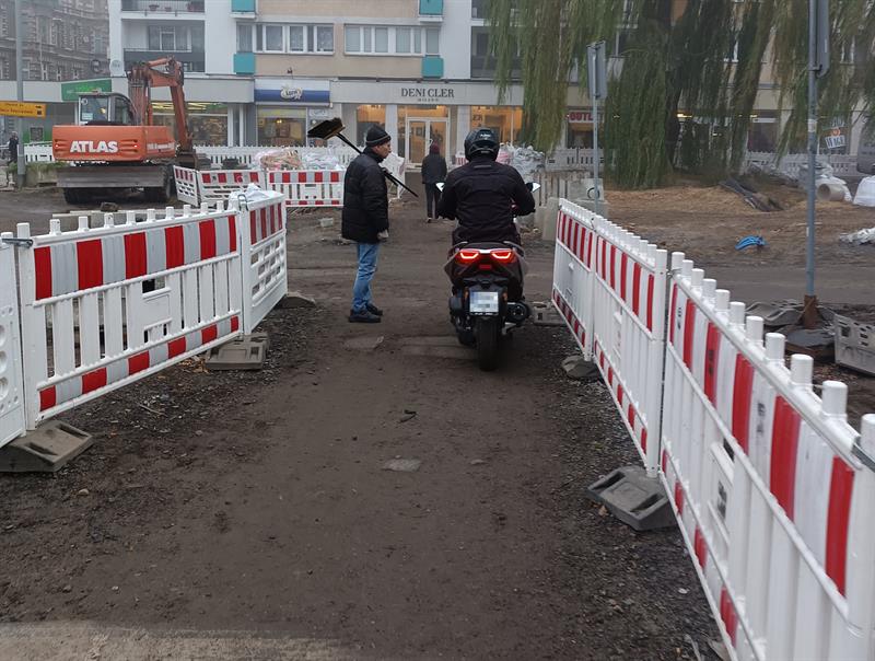W związku z ustawieniem tam od minionego wtorku blokad z powodu robót zostały wyznaczone tymczasowe przejścia przez plac budowy dla pieszych. To na zdjęciu wytyczono z myślą o nich od strony zagrodzonego wylotu z ul. Księcia Bogusława X i prowadzi ono w kierunku zabudowy znajdującej się naprzeciwko, na styku alei z ulicą Edmunda Bałuki.