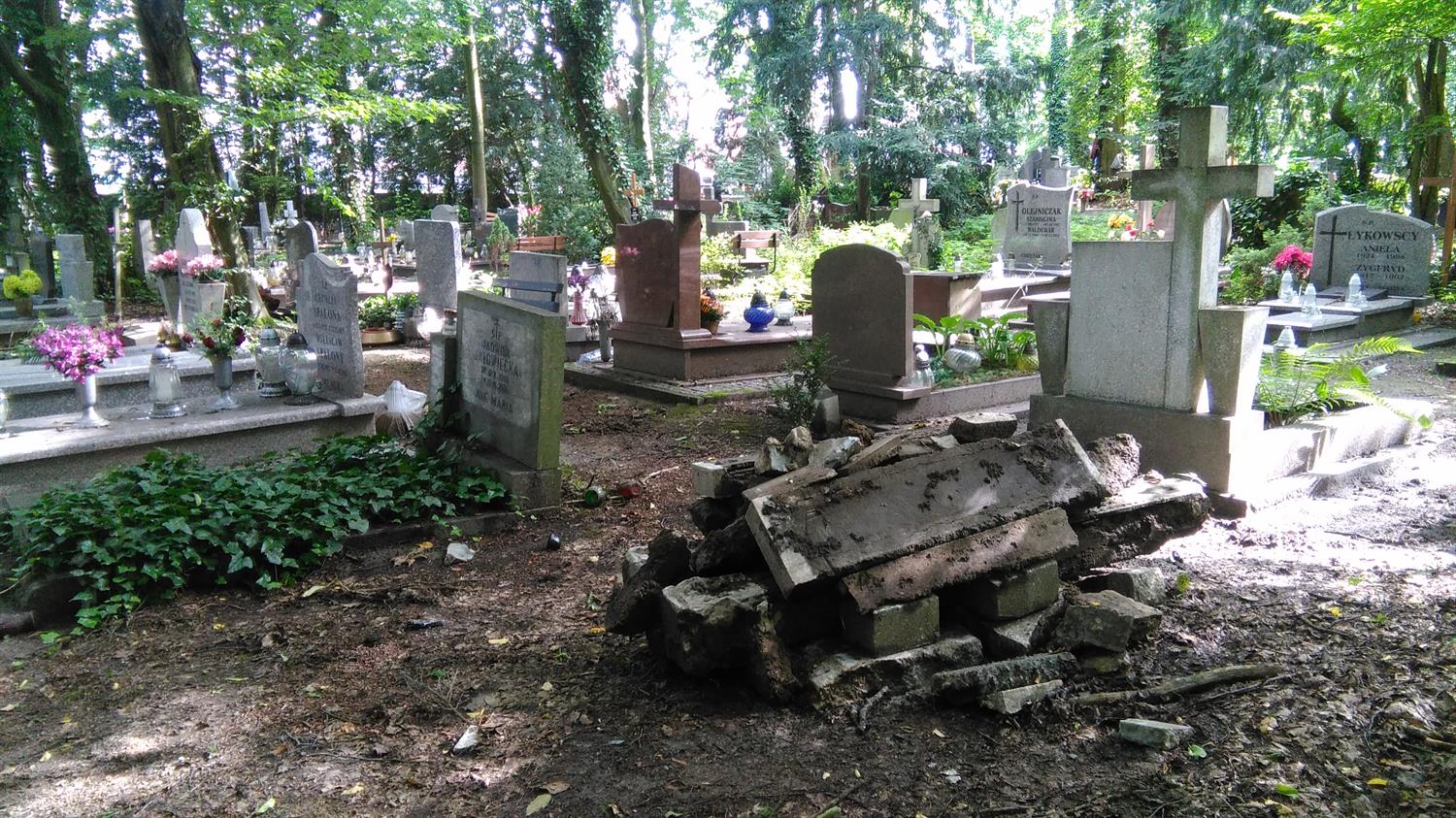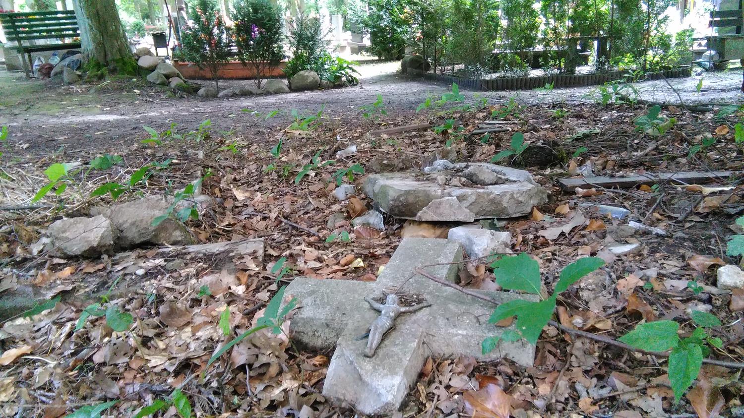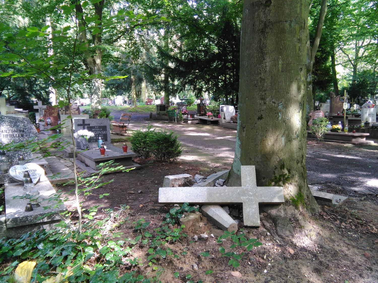 Przy jednym z głównych cmentarnych traktów - al. Lipowej - ukrzyżowany Chrystus na złamanym krzyżu leży wśród chaszczy i zeszłorocznych liści, jak reszta rozbitego nagrobka z mogiły, której opiekunowie nie opłacili miejsca na następnych 20 lat. Przy pniu starego drzewa kolejny tak przejmujący ślad przeszłości. Pozostawiony niczym memento na skraju kwatery z pochówkami z minionego wieku. Kolejny krzyż, tym razem bez krucyfiksu, zagubiony pomiędzy pniami drzew na skraju al. Dębowej. Natomiast opodal kwatery 56a wszystkie kamienie, jakie pozostały po ŚP Edwardzie - rocznik 1932, leżą porzucone na skraju drogi. Na co czekają? Może na miejsce, jakie teraz przy al. Widokowej zajmuje drewniana „tymczasówka” nagrobna, czyli pomiędzy asfaltową nawierzchnią, a czarnym i wielkim plastikowym kontenerem na odpady…