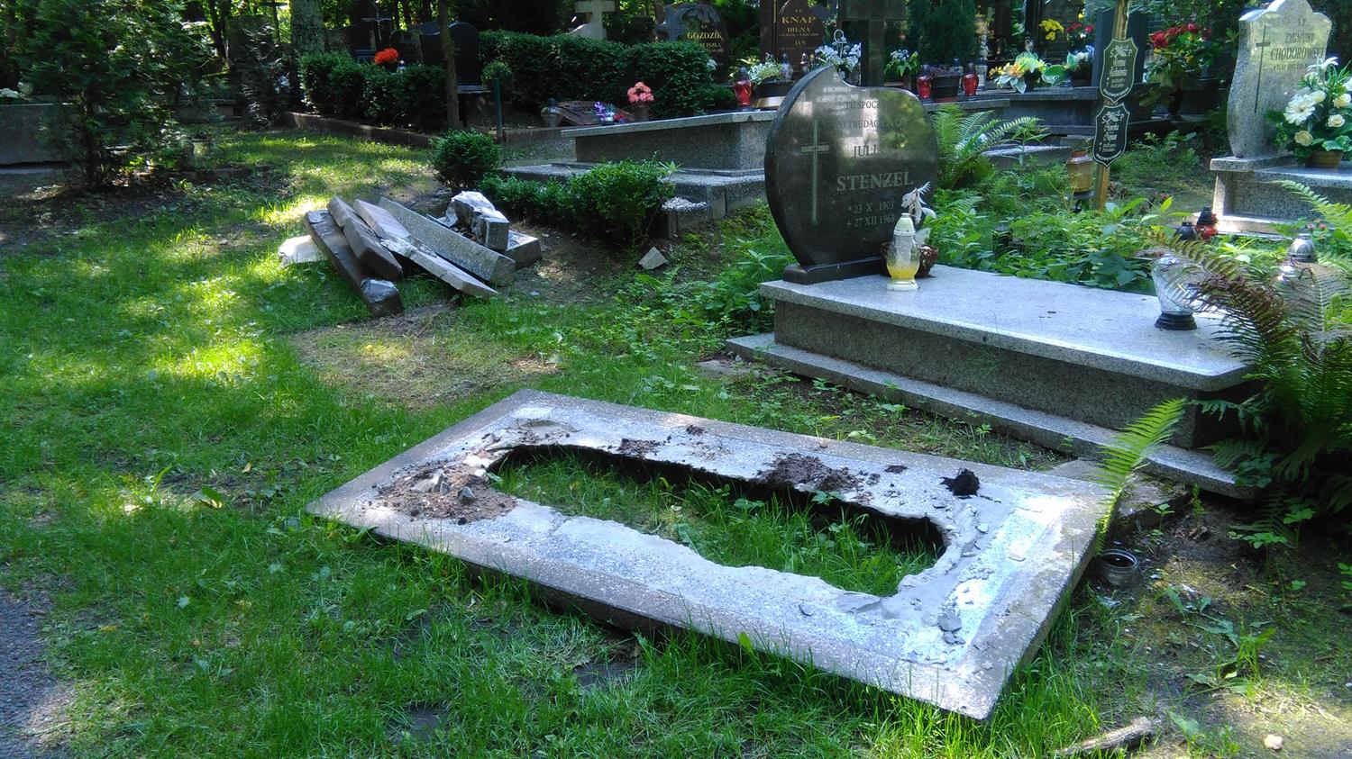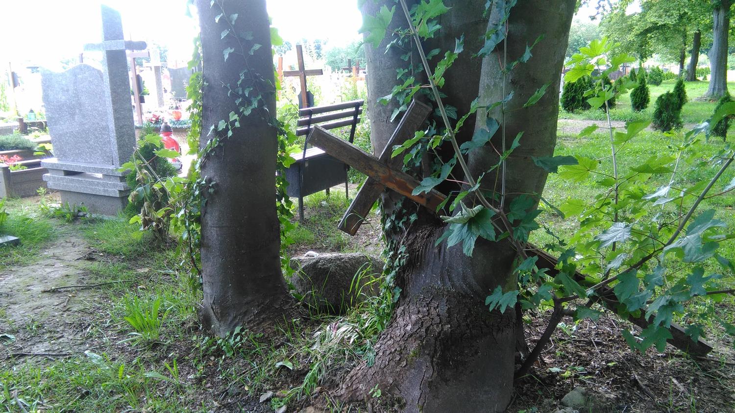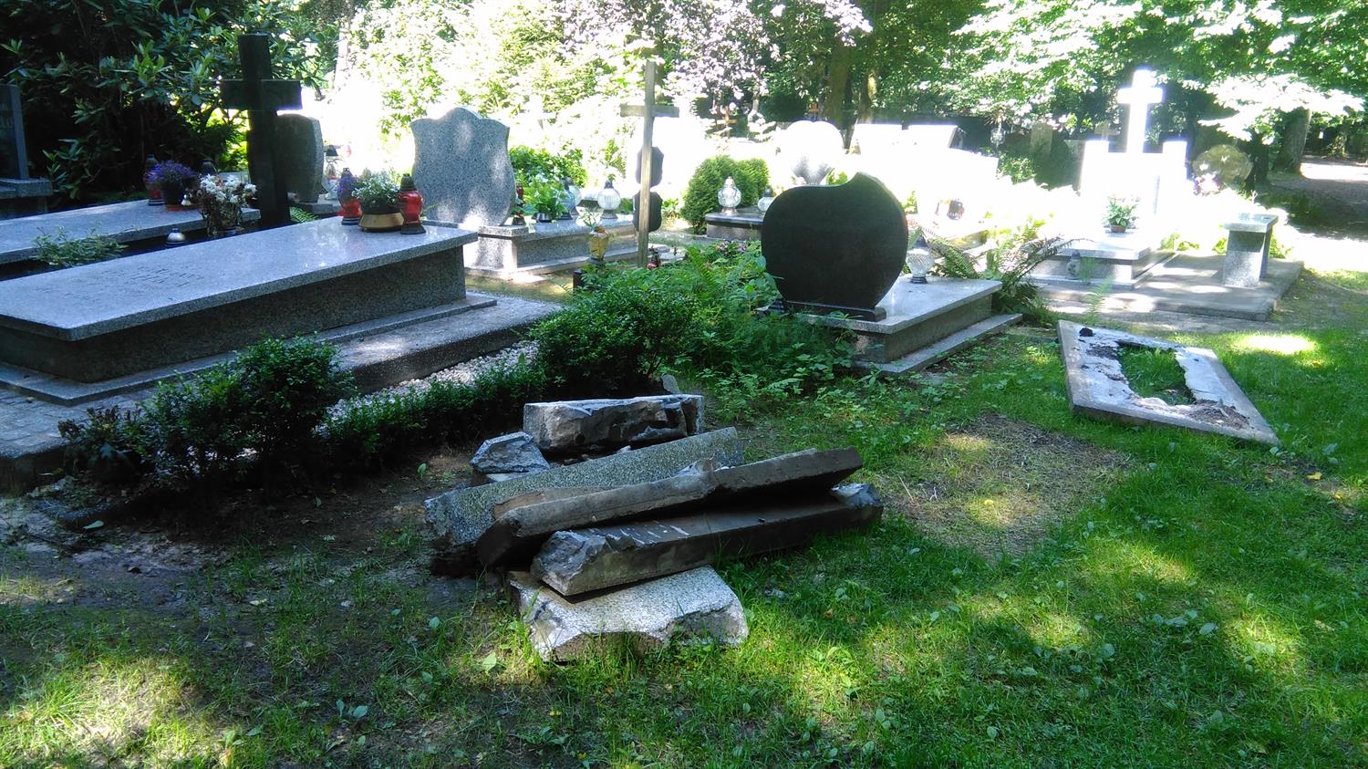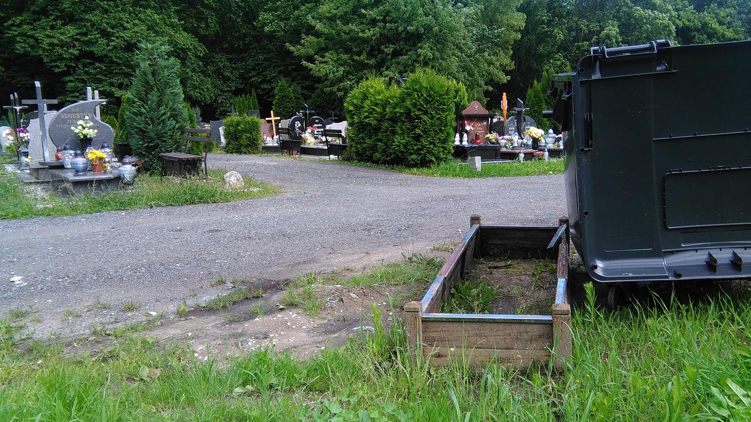 Przy jednym z głównych cmentarnych traktów - al. Lipowej - ukrzyżowany Chrystus na złamanym krzyżu leży wśród chaszczy i zeszłorocznych liści, jak reszta rozbitego nagrobka z mogiły, której opiekunowie nie opłacili miejsca na następnych 20 lat. Przy pniu starego drzewa kolejny tak przejmujący ślad przeszłości. Pozostawiony niczym memento na skraju kwatery z pochówkami z minionego wieku. Kolejny krzyż, tym razem bez krucyfiksu, zagubiony pomiędzy pniami drzew na skraju al. Dębowej. Natomiast opodal kwatery 56a wszystkie kamienie, jakie pozostały po ŚP Edwardzie - rocznik 1932, leżą porzucone na skraju drogi. Na co czekają? Może na miejsce, jakie teraz przy al. Widokowej zajmuje drewniana „tymczasówka” nagrobna, czyli pomiędzy asfaltową nawierzchnią, a czarnym i wielkim plastikowym kontenerem na odpady…