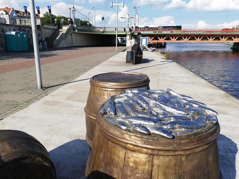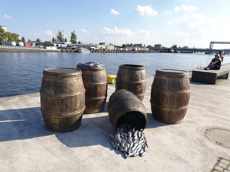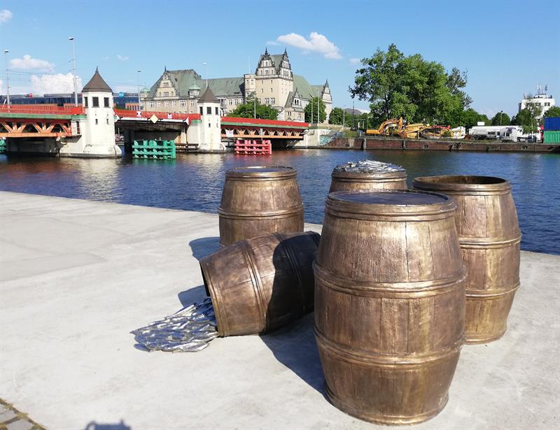 Rzeźba "beczek szczecińskich" nawiązuje do tradycji i odzwierciedla historię Szczecina, który swoje bogactwo w dawnych czasach zbudował m.in. na połowie tej ryby. Utarło się nawet powiedzenie, że był miastem handlarzy ryb, a zwłaszcza śledzia. Kompozycja składa się z czterech stojących i jednej leżącej beczki, z której wysypują się śledzie. Stanęła na nabrzeżu, by uczcić coroczne spotkanie przedstawicieli branży morskiej Herring Szczecin. Kosztowała 150 tys. zł.