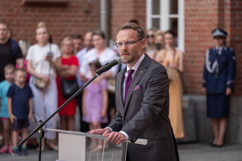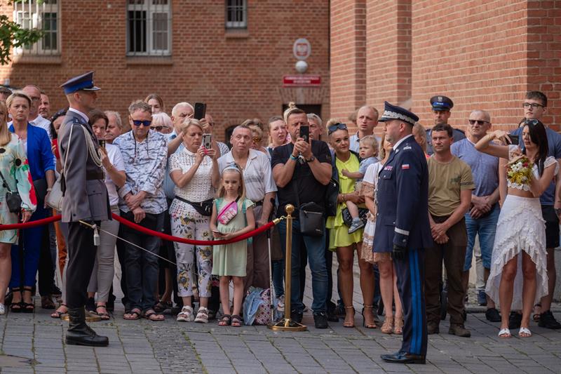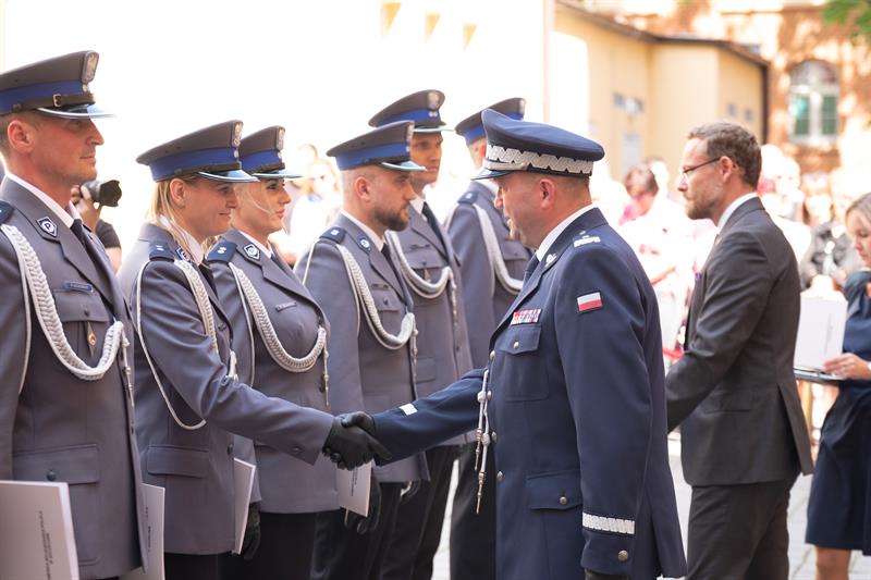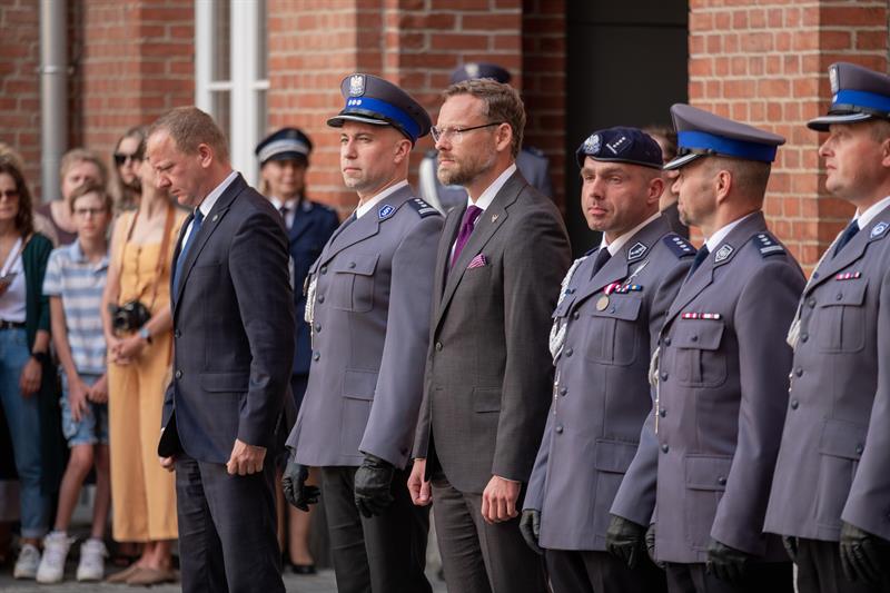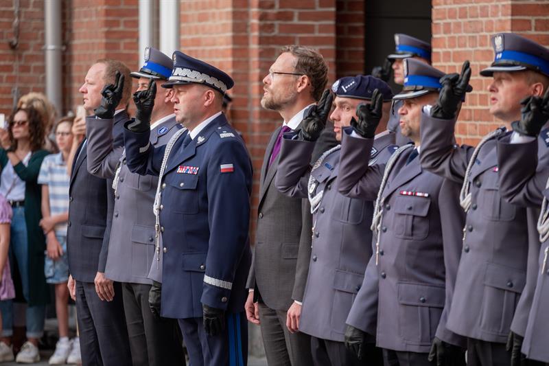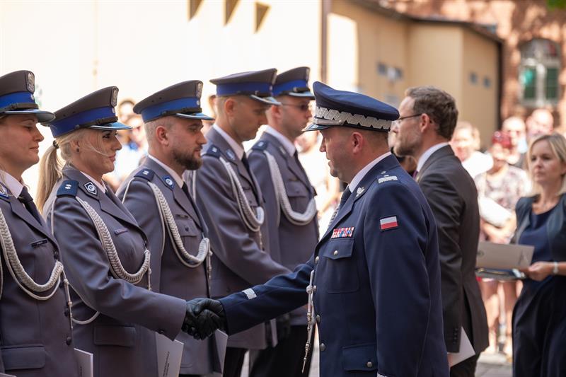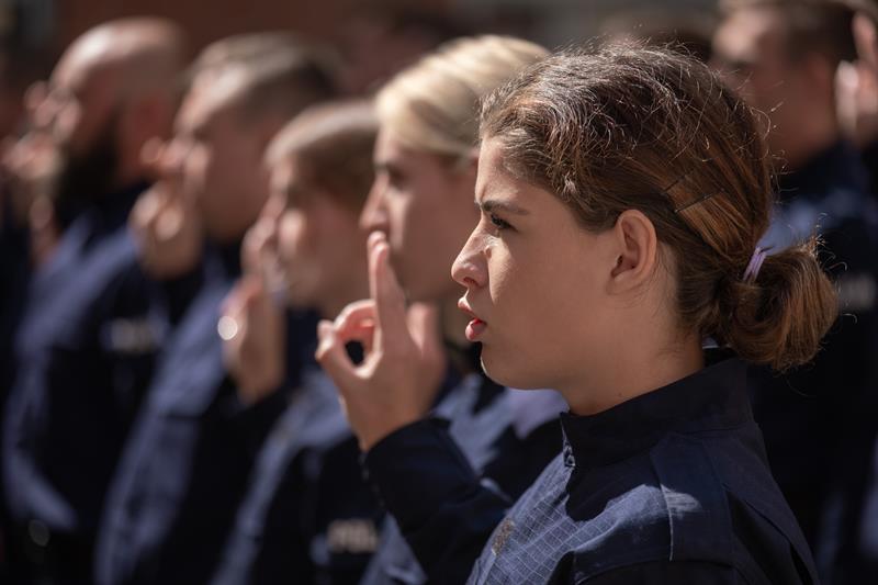 Uroczyste ślubowanie odbyło się na dziedzińcu KWP w Szczecinie. Wzięli w nim udział m.in. wojewoda Zachodniopomorski Zbigniew Bogucki, Komendant Wojewódzki Policji w Szczecinie nadinsp. Tomasz Trawiński wraz ze swoimi zastępcami, młodym funkcjonariuszom towarzyszyli też najbliżsi.