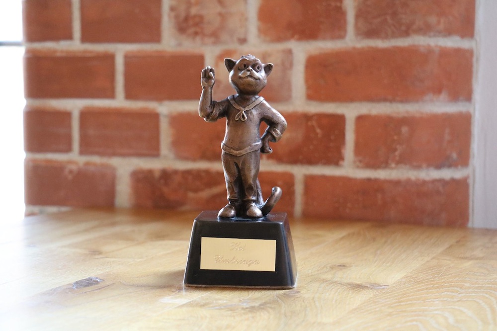 Na zdjęciu: Statuetka - Nagroda Kota Umbriagi, która jest przyznawana za znaczące osiągnięcia na polu żeglarstwa lub jego popularyzację. Przeznaczono ją dla dzieci w wieku od 6 do 12 lat oraz placówek oświatowych Pomorza Zachodniego i innych podmiotów prawnych, krzewiących żeglarstwo wśród najmłodszych. Jest to jedna z Nagród Żeglarskich Szczecina.