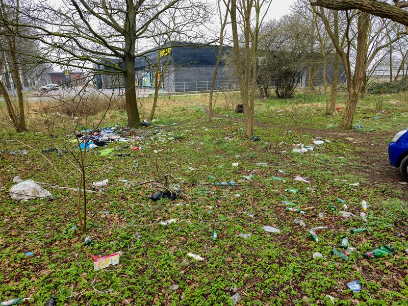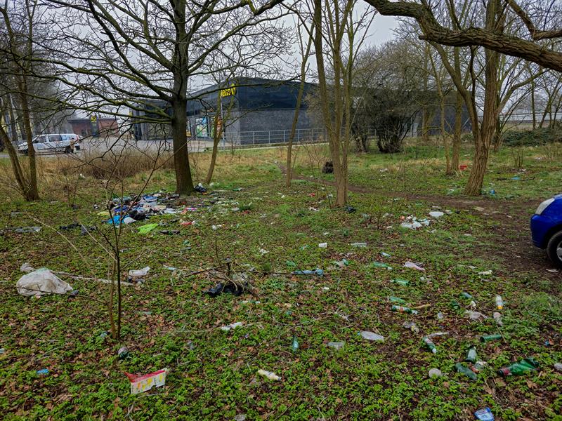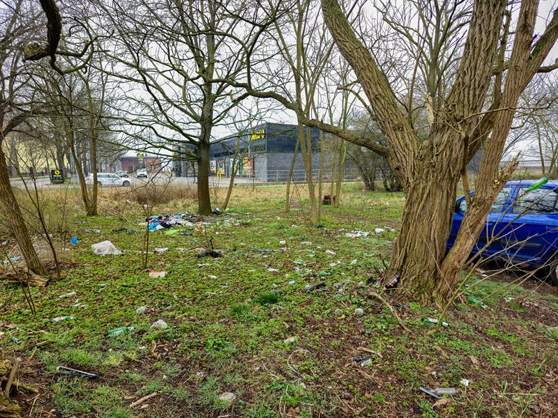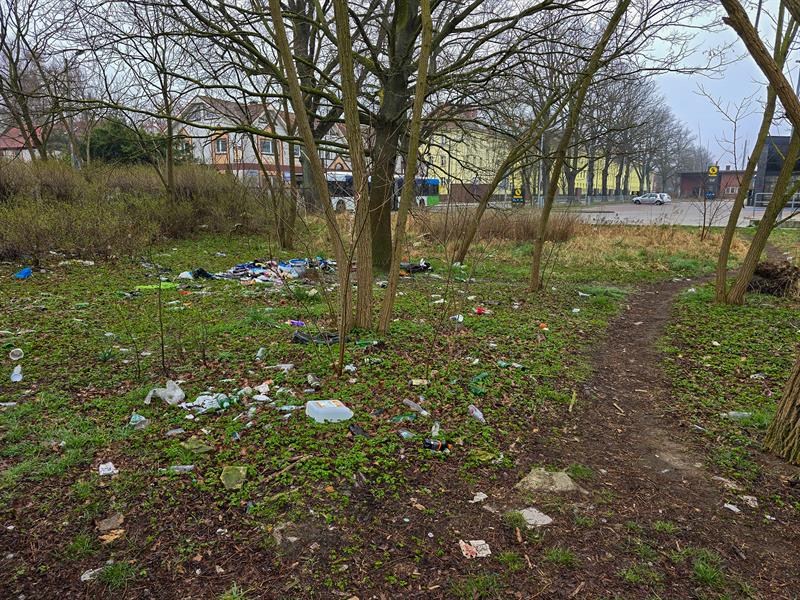 To samo można zobaczyć naokoło dyskontu znajdującego sie po drugiej stronie dworca kolejowego w Podjuchach. Śmieci zarówno na terenie, którego właścicielem jest sklep, jak i w całym sąsiedztwie, bo wiatr roznosi je po całej okolicy. A dodatkowo do 100m od sklepu w każdą stronę leżą butelki po alkoholu.
