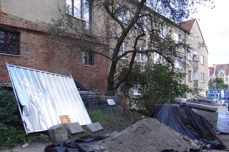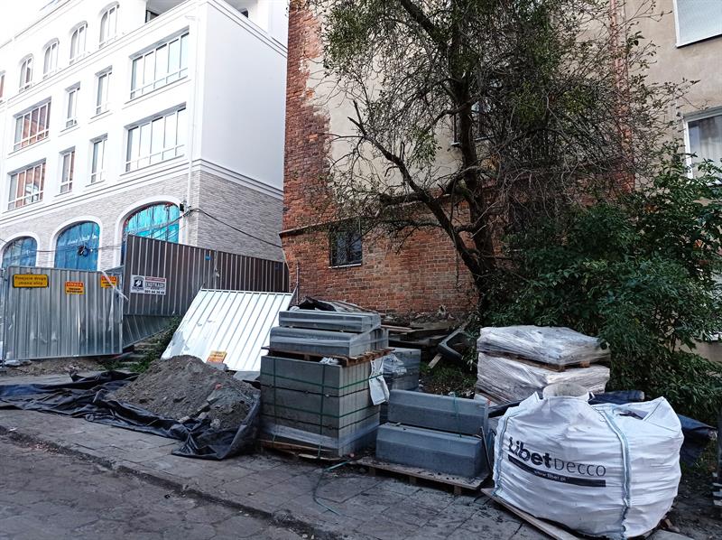 Korzenie drzewa zostały zarzucone ciężkimi materiałami budowlanymi, a krzewy zgniecione takimi też odpadami. Jak widać, trwa w najgorsze niszczenie ostatniej enklawy zieleni w tej części ul. Kurkowej, czyli w bliskości kamienica Loitzów. Przy tym fakt, że sypki beton ułożono wprost na chodniku, tamując przejście pieszym, to już… naprawdę drobiazg?