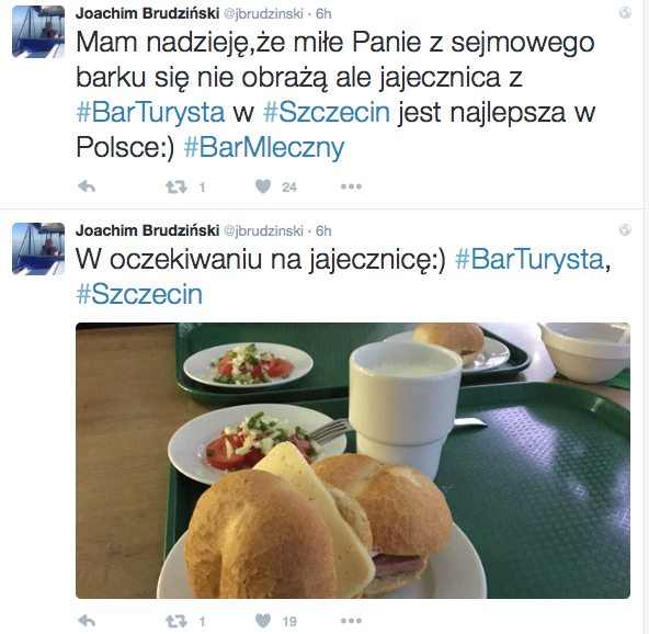- Jajecznica w Barze Turysta w Szczecinie jest najlepsza w Polsce - zachwala wicemarszałek Sejmu Joachim Brudziński. Wpływowy polityk PiS rozpoczął poniedziałek od śniadania w kultowym barze mlecznym na ul. Obrońców Stalingradu. Poza jajecznicą na boczku były bułki z żółtym serem i szynką, pomidory z cebulą i kubek mleka. Polityk PiS śniadanie obfotografował i podzielił się postrzeżeniami na Twitterze. Dodajmy, że Bar Turysta słynie nie tylko z dobrej kuchni i niskich cen, ale także z miłej obsługi. Niedaleko baru w jednej z kamienic na ul. Wyzwolenia Joachim Brudziński ma biuro poselskie. ©℗