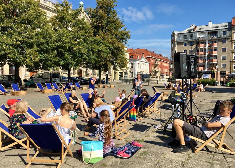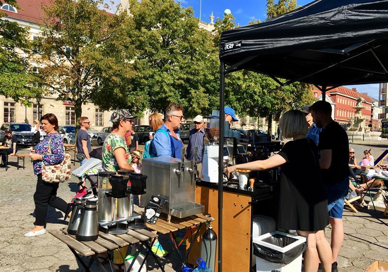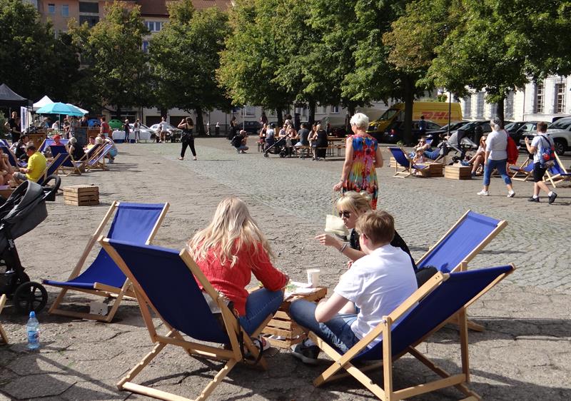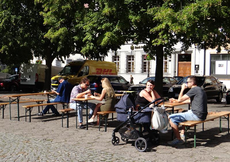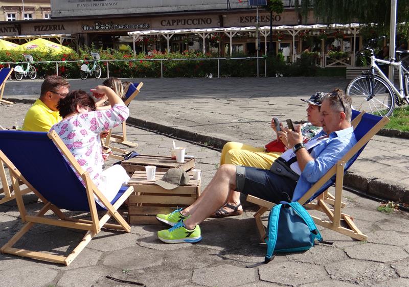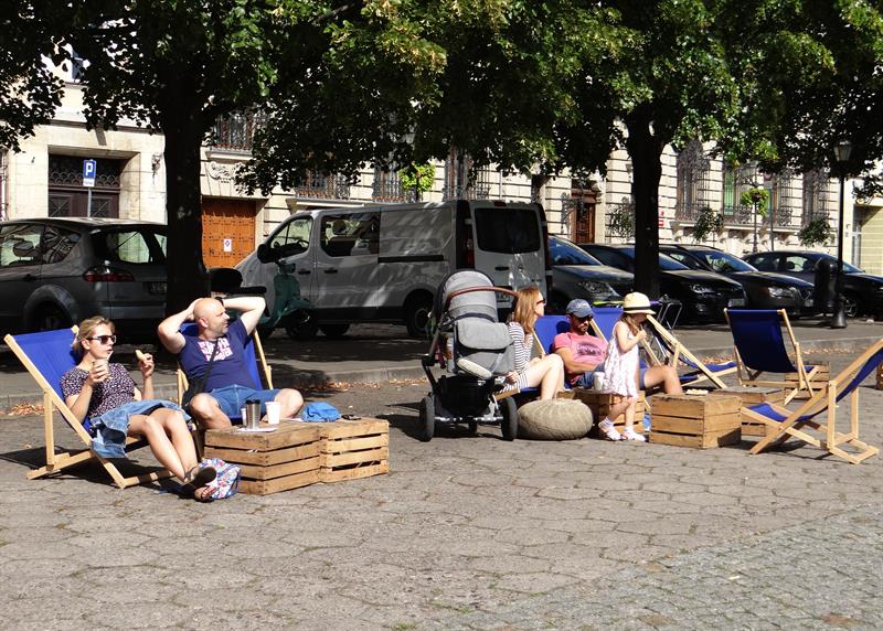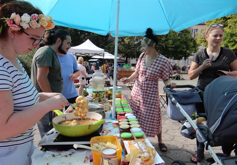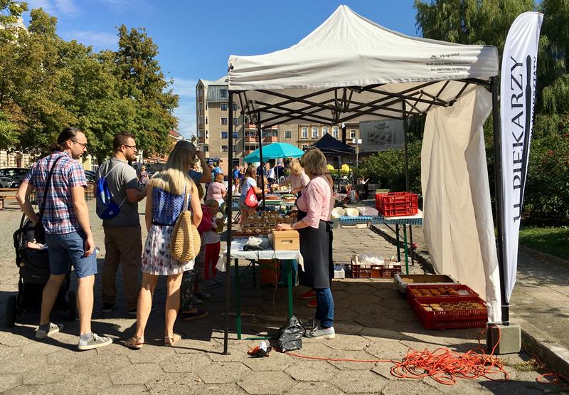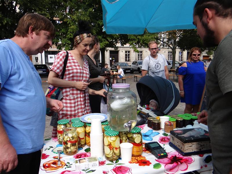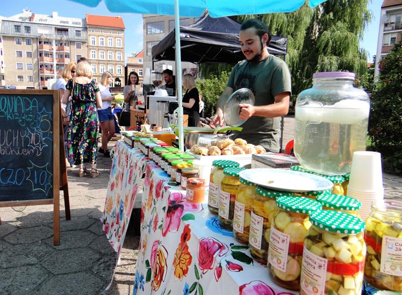 Jest kawa i lemoniady, przekąski m.in. z mniszkiem lekarskim, miody, tarty z nadzieniem na każdy smak i fantazję, podobnie jak serniki i drożdżowe ciasta. Czekają gorące racuchy, a w zalewach - przetwory z ekologicznych upraw. Goście już się rozsiadają na ławach lub zalegają na leżakach. Trwa pierwsze „Śniadanie sąsiedzkie na pl. Orła Białego".