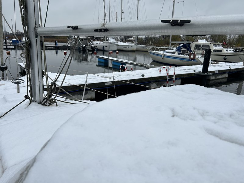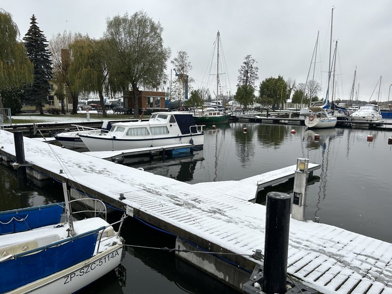 Śnieg zasypał w sobotę także przystań żeglarską Pogoni w Szczecinie. Dla żeglarzy to ostateczny znak, że tegoroczny sezon jest już definitywnie zakończony.