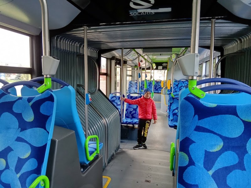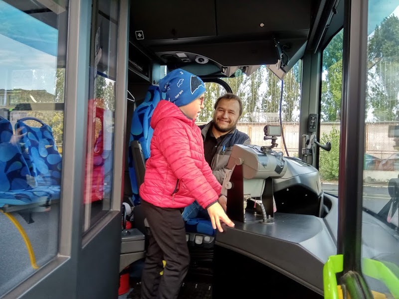 Filip jechał już zabytkowym autobusem, nowoczesnym Solarisem przejechał przez myjnię, umie kontrolować oświetlenie i przygotować autobus do jazdy.
