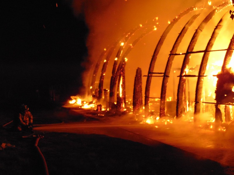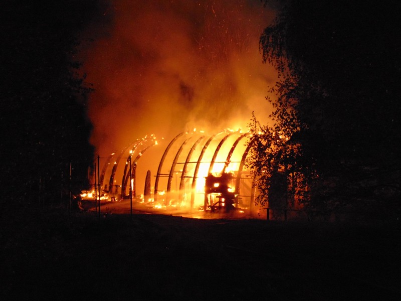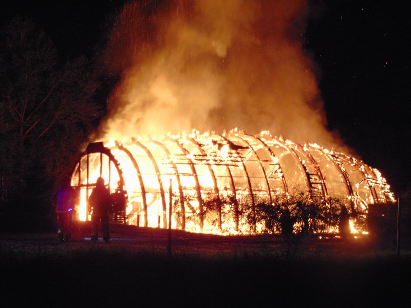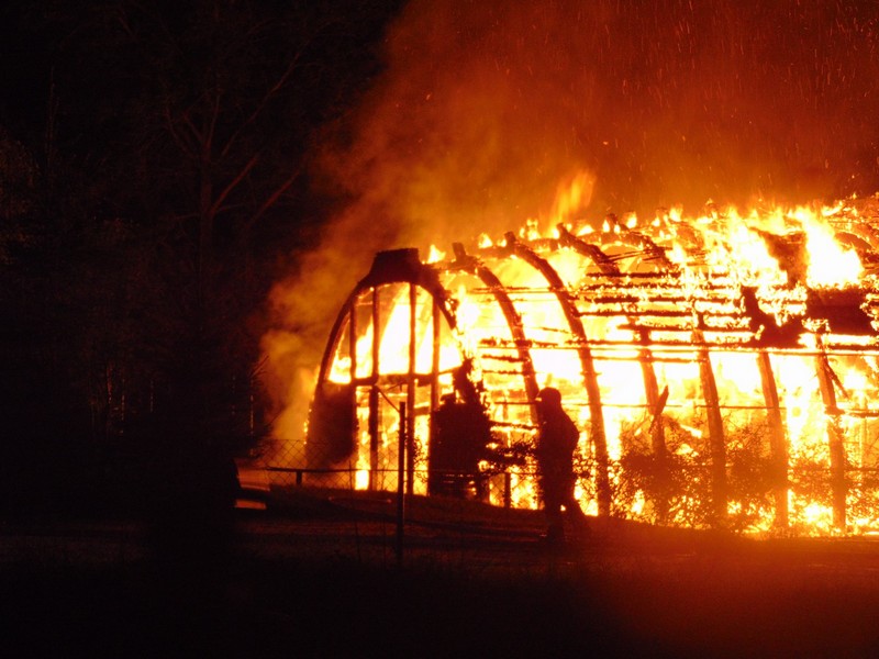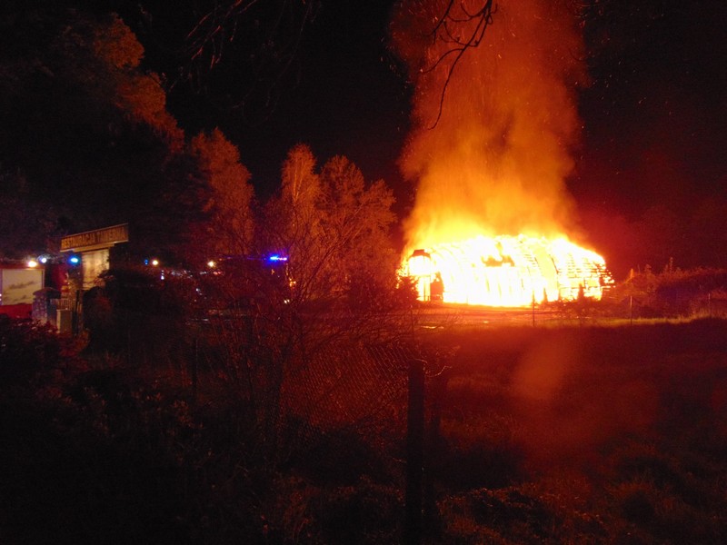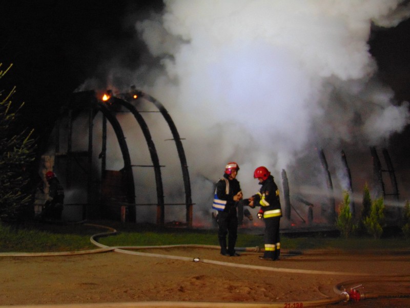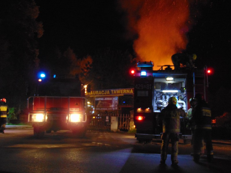 Zgłoszenie o pożarze na terenie ośrodka wypoczynkowego Jermak w Gudowie nad j. Lubie strażacy otrzymali o g. 3.17. W ogniu stanęła drewniana tawerna w kształcie odwróconej łodzi. Ogień rozprzestrzeniał się bardzo szybko.