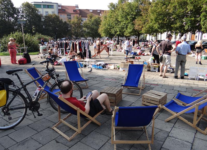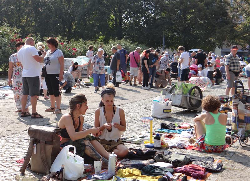 Równolegle z pchlim targiem (do godz. 15) odbywa się sąsiedzki poczęstunek. W cieniu drzew: za pomnikiem Flory, a na wysokości hamaków ogrodu sąsiedzkiego. Trudno go nie zauważyć, tym bardziej że jego specjały zostały wyłożone na okrągłym stole. Tym samym, który na dachu „Przełomów" nie tak dawno służył za symboliczny, rocznicowy rekwizyt.