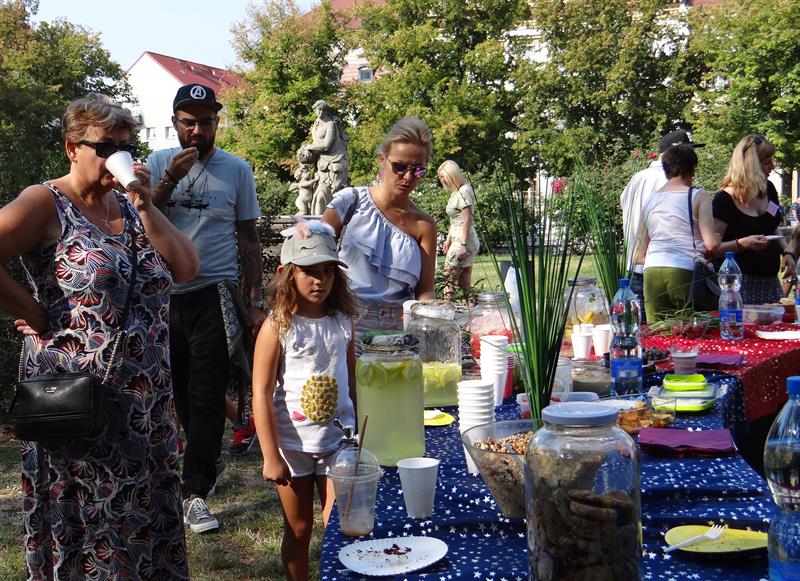 Jednak teraz ugina się pod ciężarem lemoniad (cytrynowa i arbuzowa), kuskusu z warzywami, zapiekanek z cukinii, małosolnych ogórków, pomidorków koktajlowych, twarożku z rzodkiewką, wegańskich past m.in. z cieciorki i fasoli. Są również śliwki, winogrona, arbuzy, a z ciast palce lizać np. babeczki z jagodami i truskawkami, kruche ciastka z delicjami, murzynki i śliwkowce. Można się częstować i dokładać - od siebie - kolejne smakowite specjały.