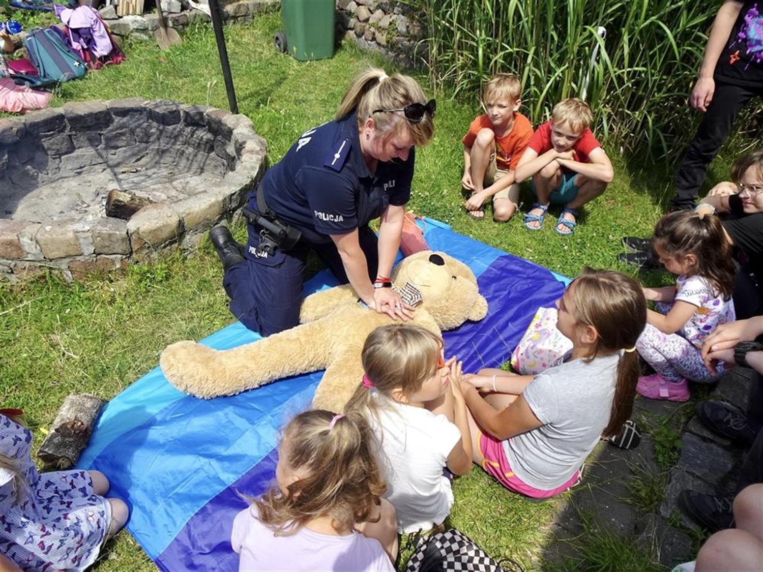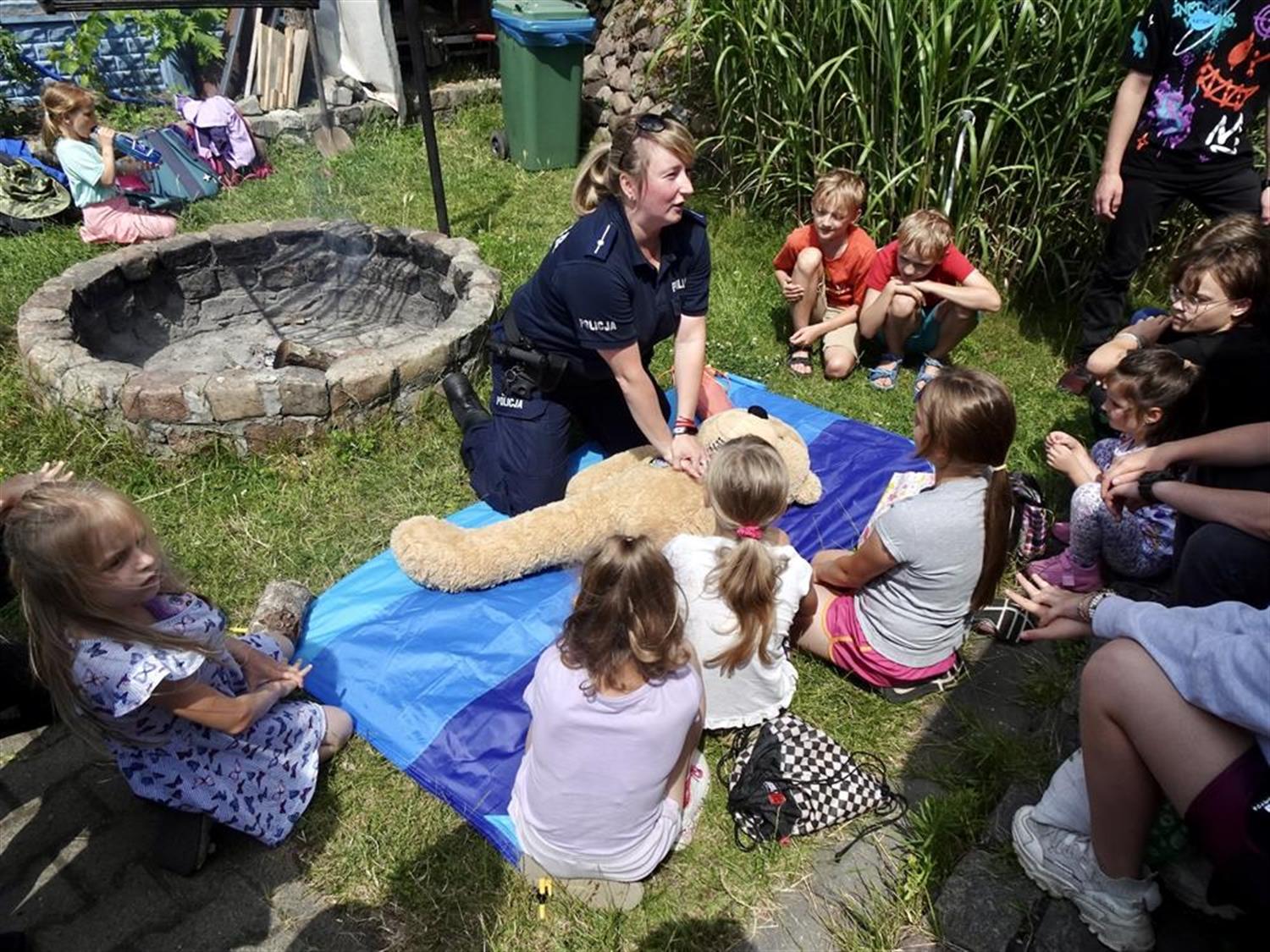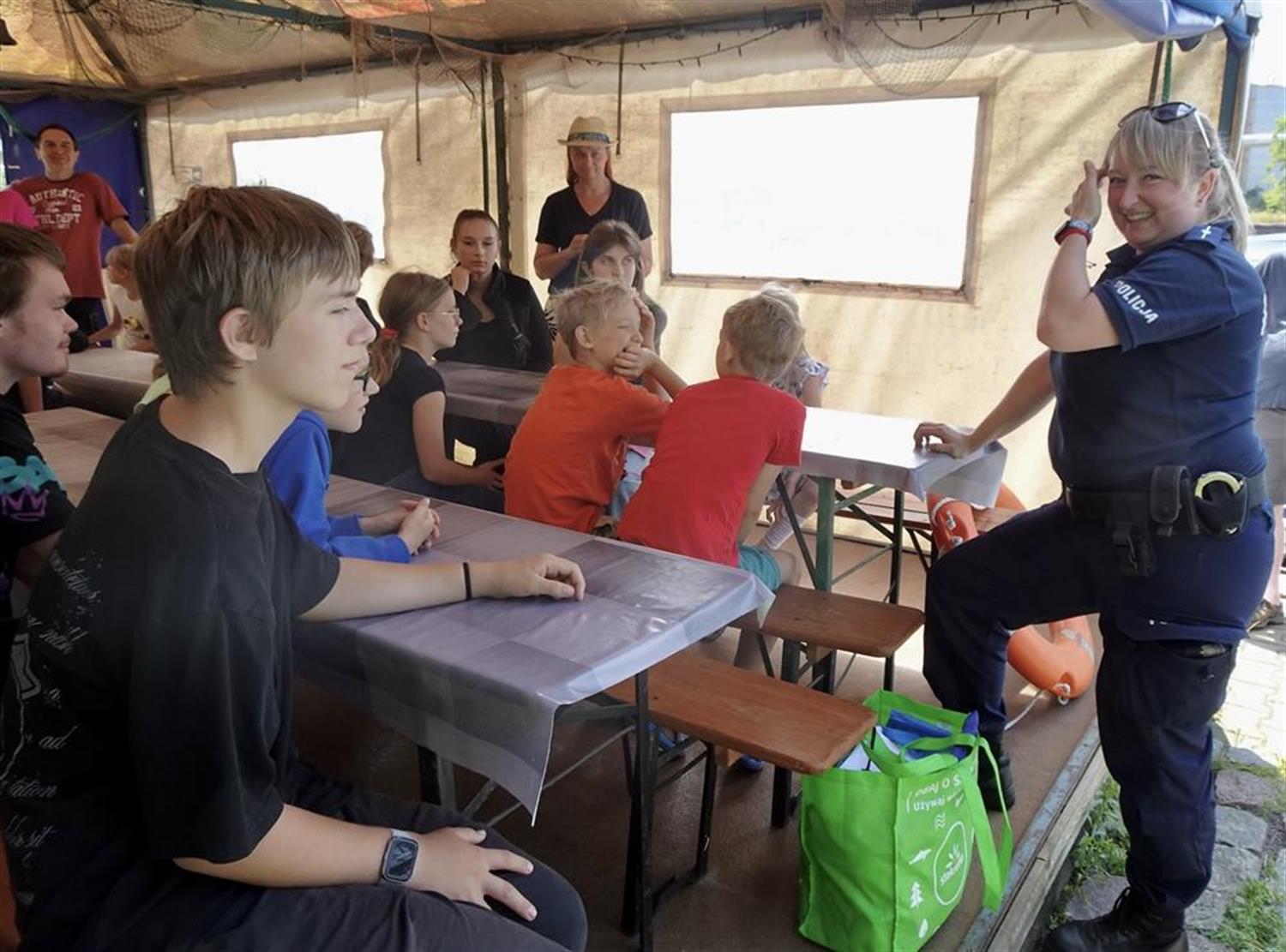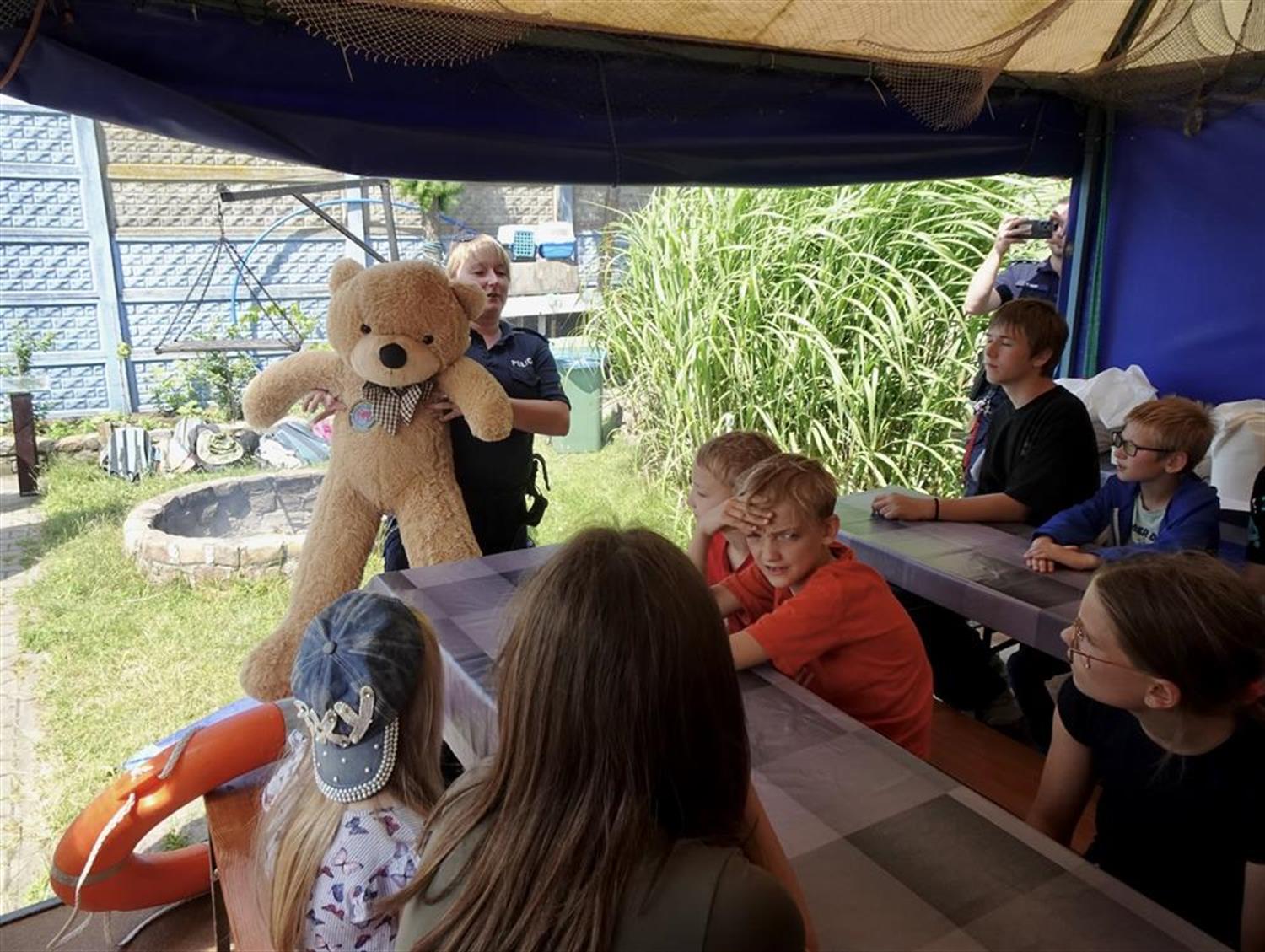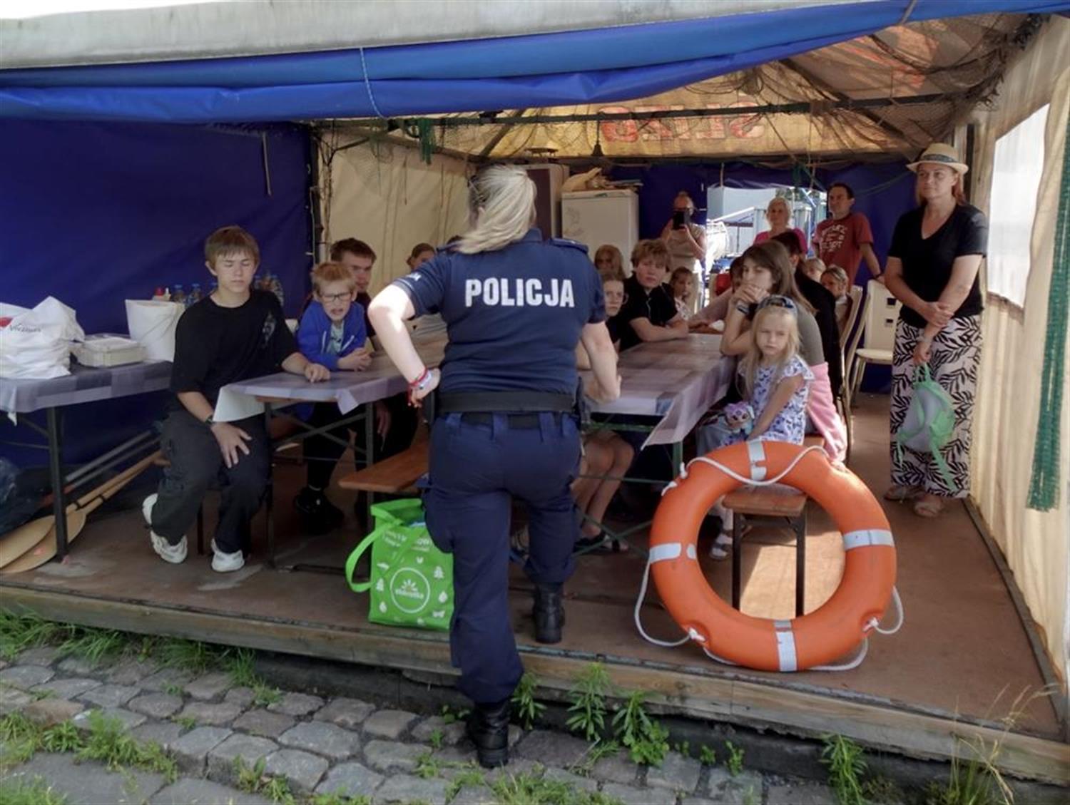 Funkcjonariusze Komisariatu Wodnego Policji w Szczecinie, aspiranci Agnieszka Mróz i Rafał Nicki przypłynęli na spotkanie łodzią policyjną. Przygotowali dla dzieci szereg konkursów. Policjantka omówiła zasady bezpieczeństwa nad wodą, a także zademonstrowała na dużym misiu, jak udzielać pierwszej pomocy przedmedycznej.