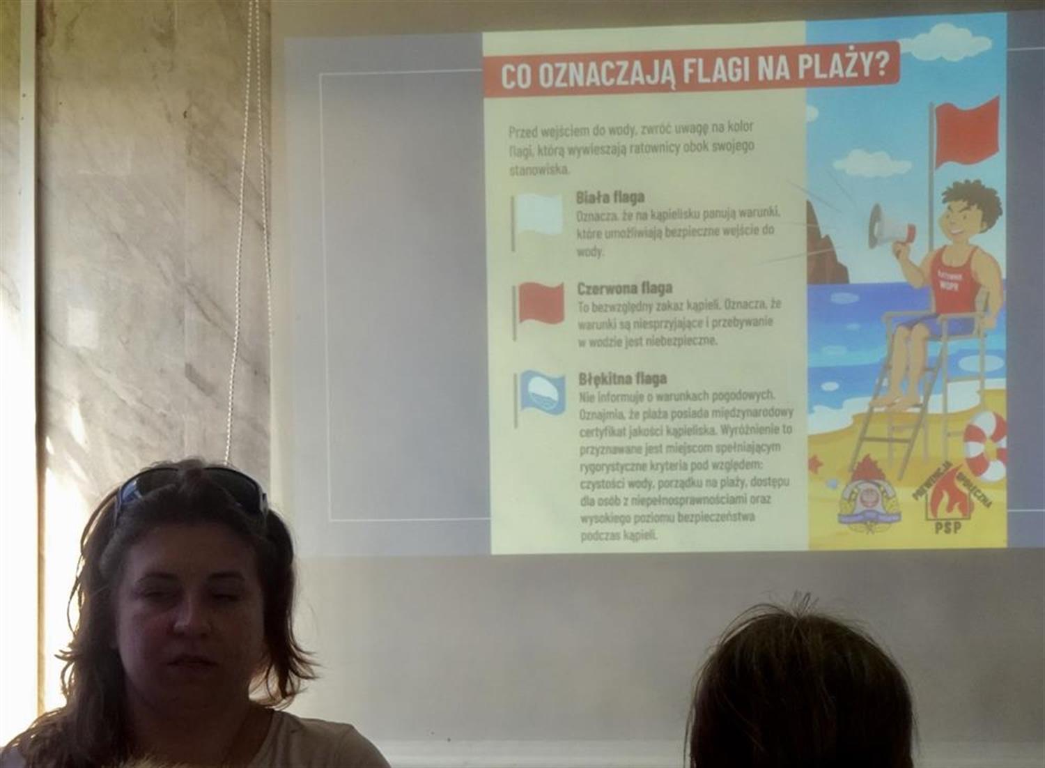 Odpowiedzi padały różne: wodę do picia, krem z filtrem, kapok, strój kąpielowy... Prelegentka uzupełniła wiedzę najmłodszych i tłumaczyła, dlaczego warto np. wziąć też ubranie na zmianę i parasol chroniący przed słońcem. Mówiła ponadto, w jaki sposób są oznakowane kąpieliska, co oznaczają kolory bojek i flag, dlaczego czasami nie można wchodzić do wody. Przybliżyła podstawowe zasady bezpieczeństwa nad wodą i zachęcała do wybierania kąpielisk strzeżonych.