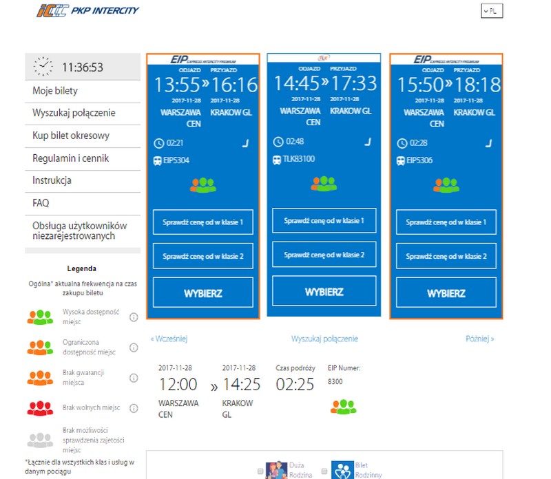 Jak wynika z przeprowadzonych przez PKP Intercity badań na grupie ponad 830 osób, dla blisko 75 proc. podróżnych informacja o zajętości miejsc w pociągu ma duże znaczenie w podejmowaniu decyzji o zakupie biletu. Stąd na stronie intercity.pl przy każdym z połączeń znajduje się już informacja o frekwencji w danym pociągu. W lewym dolnym rogu witryny została umieszczona legenda z wyjaśnieniem każdego oznaczenia. Dzięki temu rozwiązaniu podczas planowania podróży pasażer może sam sprawdzić frekwencję w pociągu i zdecydować się na wybór konkretnego połączenia. Frekwencja jest wyświetlana w czasie podejmowania decyzji o zakupie biletu i aktualizowana na bieżąco w systemie. Z funkcji tej można skorzystać także przy wyborze przejazdu z przesiadką.