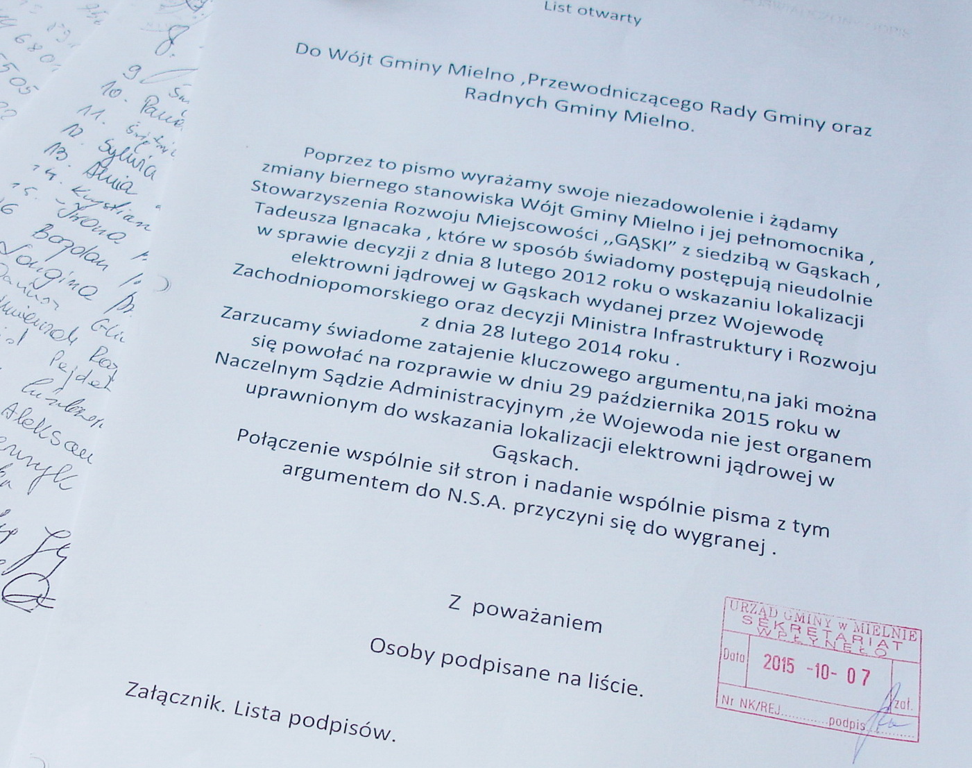 Nadawcy wyrażają niezadowolenie i żądają zmiany biernego stanowiska przed Naczelnym Sądem Administracyjnym w Warszawie. W piśmie do wójta gminy, przewodniczącego rady i pozostałych samorządowców m.in. stwierdzają: „Zarzucamy świadome zatajenie kluczowego argumentu, na jaki można się powołać na rozprawie w dniu 29 października 2015 roku w NSA, że wojewoda nie jest organem uprawnionym do wskazania lokalizacji elektrowni jądrowej w Gąskach. Połączenie sił stron i nadanie wspólnie pisma z tym argumentem do NSA przyczyni się do wygranej”.