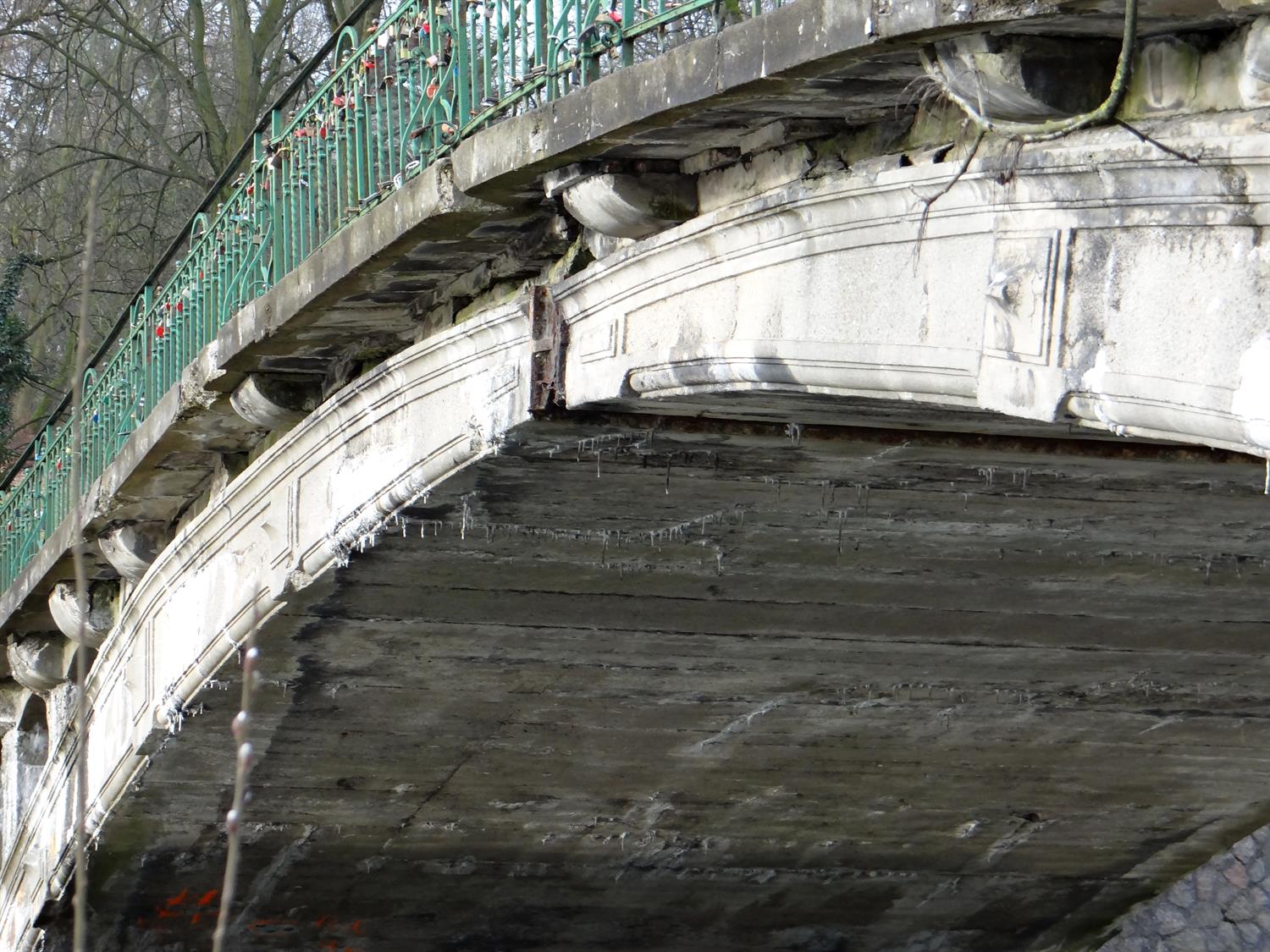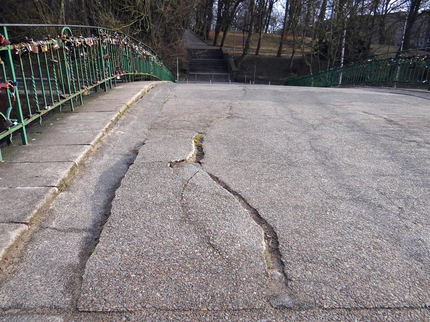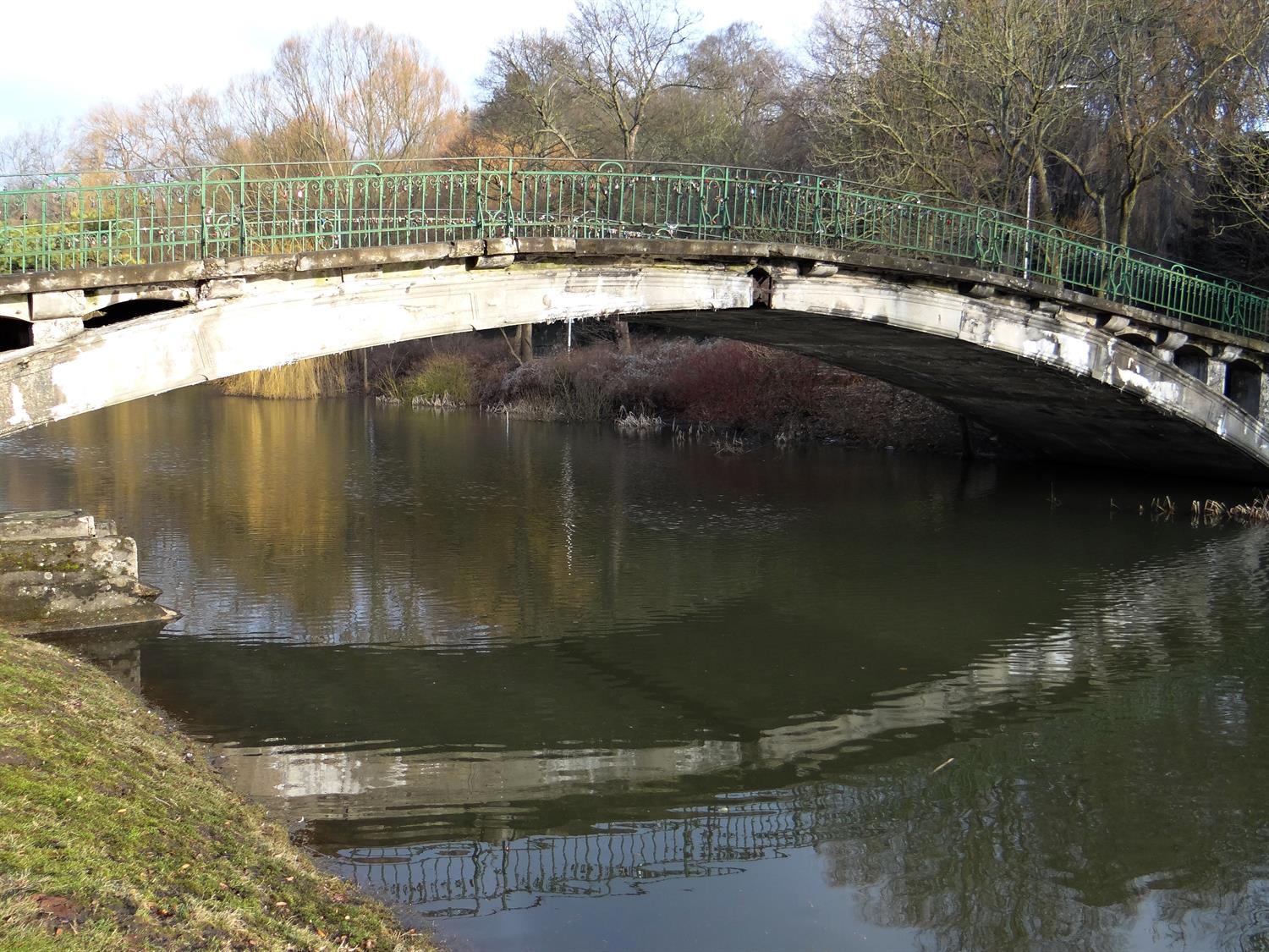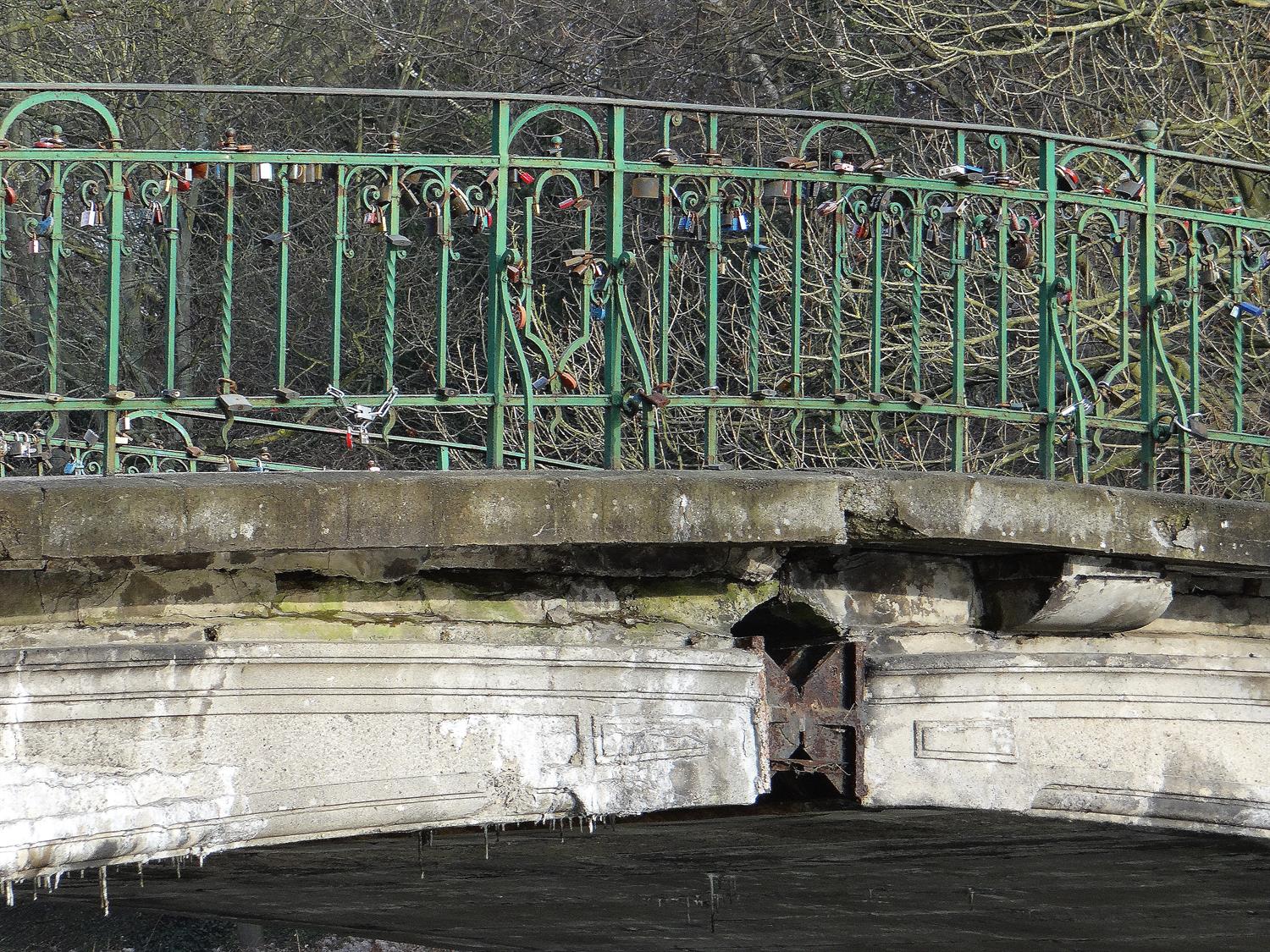 Korozja niszczy zarówno zbrojenie, jak i betonową konstrukcję łukowego mostu nad Rusałką w parku Kasprowicza. Jest on tak spękany i pełen ubytków, że ledwie trzyma się brzegów jeziora. Według zamówionej przez miasto ekspertyzy, stan przęseł skrajnych został określony jako przedawaryjny, co oznacza: „Wykazuje nieodwracalne uszkodzenia dyskwalifikujące przydatność użytkową". Dlaczego więc wejście na ów most jeszcze nie zostało zamknięte?