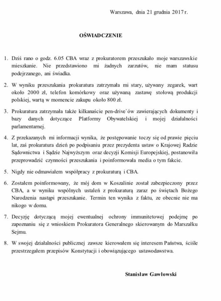 Stanisław Gawłowski, poseł i polityk PO którego mieszkanie w Warszawie w czwartek przeszukała prokuratura i Centralne Biuro Antykorupcyjne, na swoim profilu na Facebooku opublikował specjalne oświadczenie na ten temat. Poniżej publikujemy jego treść: