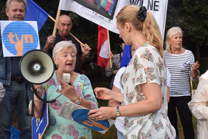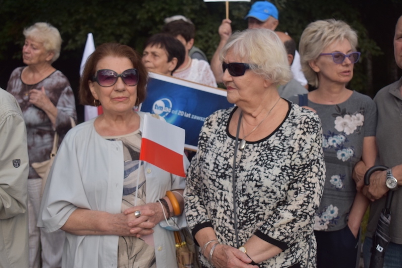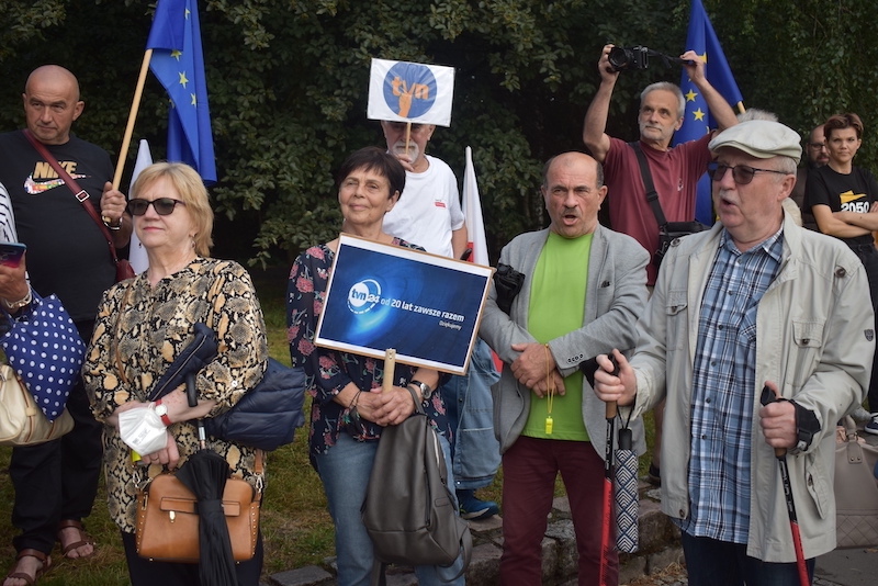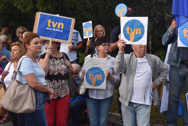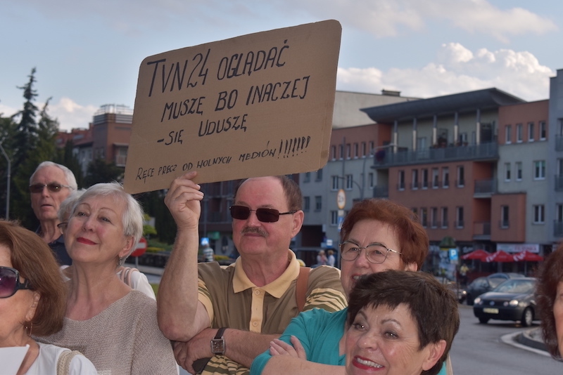 Na skwerze przy pl. Wolności spotkało się kilkadziesiąt osób z plakatami, flagami i transparentami. Mieszkańcy skandowali "precz z łapami od TVN!", wolni ludzie, wolne media, wolna Polska!".