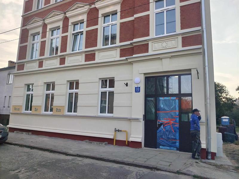 Budynek zyskał nową elewację. Kilkadziesiąt lat temu znajdowała się w nim izba wina i piwa. Stąd na froncie przedwojenny napis.