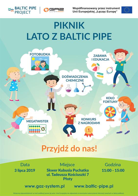 W środę, 3 lipca, w Płotach odbędzie się pierwszy z cyklu pikników edukacyjnych dla dzieci „Lato z Baltic Pipe”, którego organizatorem jest spółka Gaz-System. Celem pikników będzie przybliżenie wiedzy na temat projektu Baltic Pipe – gazowego połączenia biegnącego z Szelfu Norweskiego do Polski wraz z rozbudową polskiego systemu przesyłowego.
