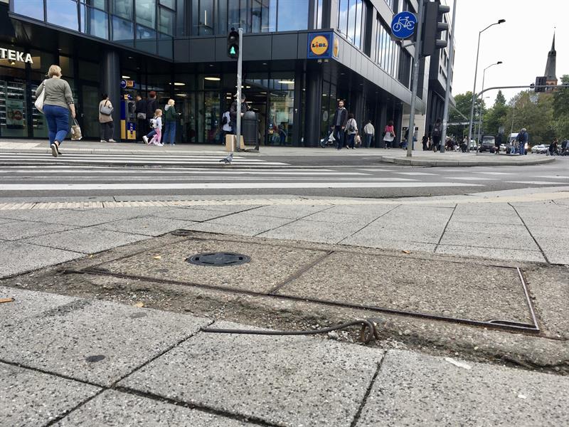 Taka pułapka czyha na przechodniów w ruchliwym punkcie Bramy Portowej w Szczecinie. W obrębie wysepki między jezdniami na przejściu dla pieszych sterczy pręt z wyszczerbionej pokrywy znajdującej się w nawierzchni studzienki.