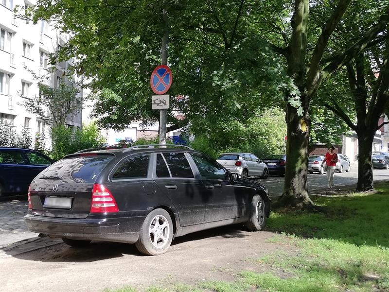 Auto stoji przed znakiem zakazu czyli prawidlowo, w zaden sposob nie blokuje chodnika ,ba nawet zieleni nie tyka.