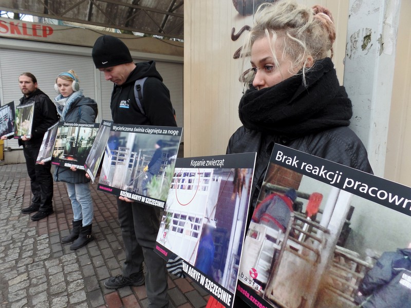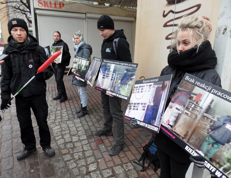W rzeźniach trzech zachodniopomorskich miast - Szczecina, Przechlewa i Witkowa - dochodziło do przypadków znęcania się nad zwierzętami. Łańcuchami ciągnięto je za nogi, dźgano ostrymi przedmiotami, bito i kopano. Były uderzane we wrażliwe części ciała, a padłe w transporcie przewożone wózkami na osłabionych, ale wciąż żywych. Obrazy haniebnej przemocy wobec zwierząt zostały zarejestrowane przez aktywistów Inicjatywy na Rzecz Zwierząt BASTA! oraz Międzynarodowego Ruchu na Rzecz Zwierząt Viva! Dały podstawę do wszczęcia trzech niezależnych śledztw przez prokuraturę. O czym w poniedziałek (11 bm.) przypominali uczestnicy demonstracji na pl. Kilińskiego w Szczecinie.