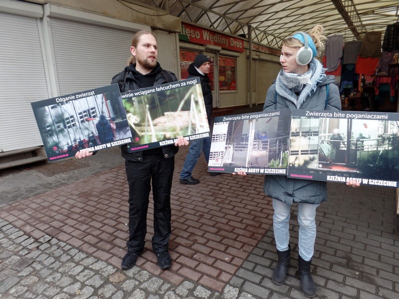 Miejsce protestu było nieprzypadkowe. Na tamtejszym rynku funkcjonują bowiem sklepy handlujące mięsem pochodzącym z jednej z inkryminowanych rzeźni. W trakcie demonstracji przechodniom rozdawano ulotki przedstawiające poruszające fakty krwawych realiów panujących w przemysłowych hodowlach i rzeźniach. Jednocześnie zachęcające: