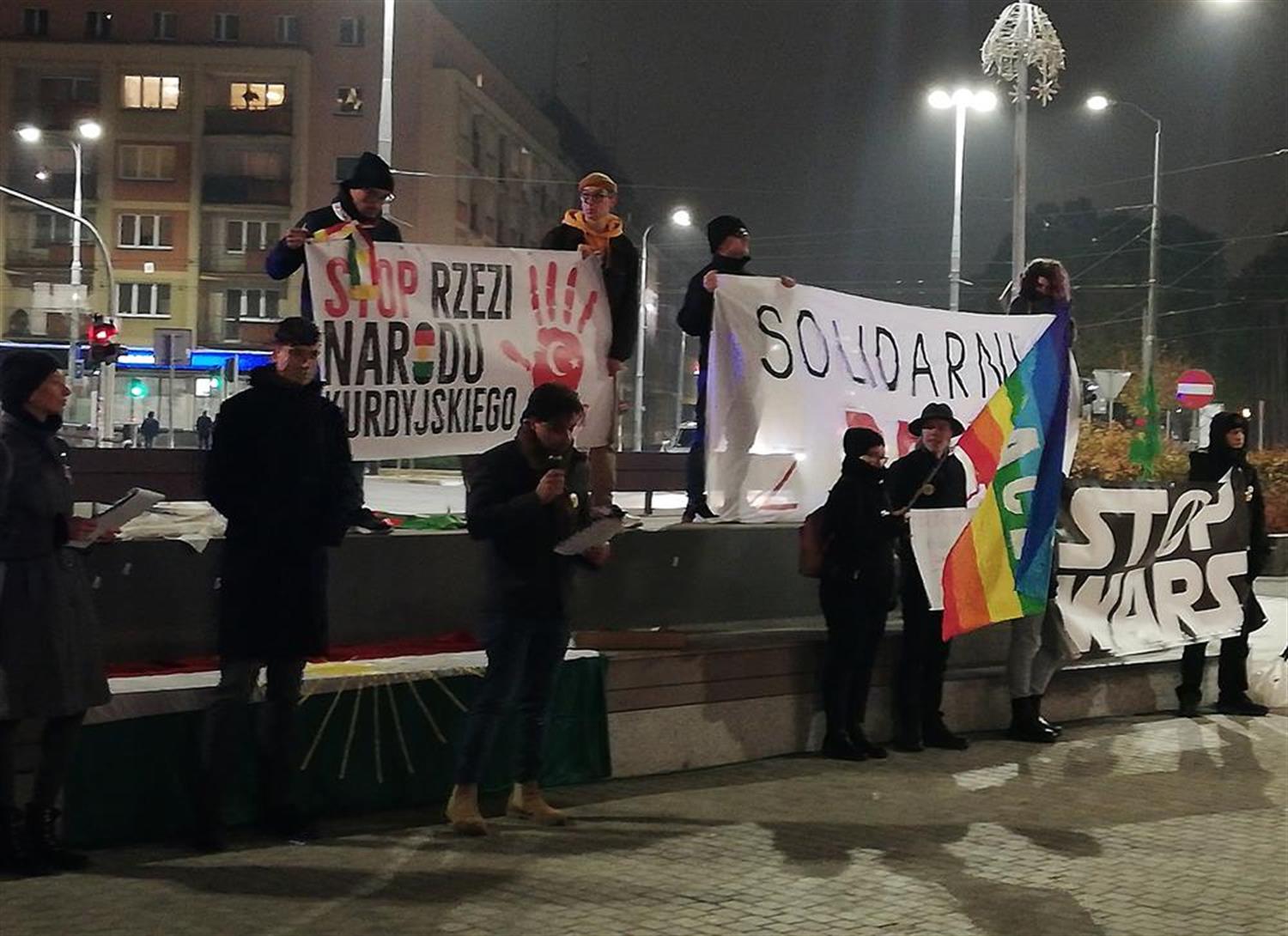 Przyszli w geście solidarności z bezbronnymi, cywilnymi ofiarami wojny w Syrii. Aby wyrazić swój sprzeciw wobec ingerencji militarnej Turcji oraz milczącego przyzwolenia światowych mocarstw, biernie przyglądających się czystkom etnicznym, rzezi Kurdów - wielkiego narodu, którzy - jak niegdyś Polacy - są pozbawieni niepodległej państwowości. Mowa o uczestnikach demonstracji antywojennej, jaka w czwartek (14 bm.) odbyła się na pl. Adamowicza w Szczecinie.