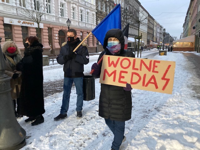- Totalna władza, która ma coś do ukrycia, boi się wolnych mediów - przemawiał. - To z wolnych mediów dowiadywaliśmy się o przekrętach Szumowskiego, nartach Emilewicz, o pobytach w hotelach pani Pawłowicz. Pamiętajmy wszyscy o odebranych prawach kobietom. Wcześniej protestowaliśmy pod sądami, pod szkołami, teraz Czarnek planuje maturę z katechezy. Dokręcają śrubę. Z jednej strony to straszne, z drugiej może dotrze do wszystkich grup społecznych, nawet tych, którym dzięki rządom PiS-u poprawiły się dochody. Może dotrze do nich, że 500 plus to nie wszystko. Że przede wszystkim musimy żyć w wolnym, sprawiedliwym kraju. Gdzie nikt nam - obywatelkom, obywatelom i mediom nie zakrywa ust.